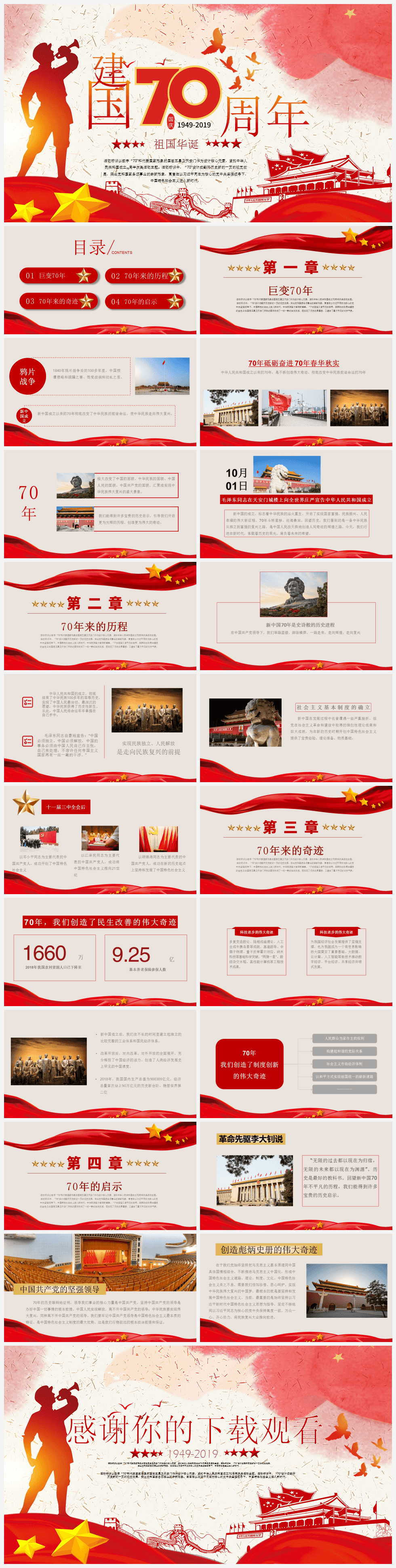 本作品内容为红色中国风庆祝建国70周年PPT模板。 格式为 pptx, 大小9MB, 页数为22,比例自定义, 请使用软件PowerPoint打开, 作品中主体文字及图片可替换修改,文字修改可直接点击文本框进行编辑,图片更改可选中图片后单击鼠标右键选择更换图片,也可根据自身需求增加和删除作品中的内容, 源文件无水印, 欢迎使用发发资源库。