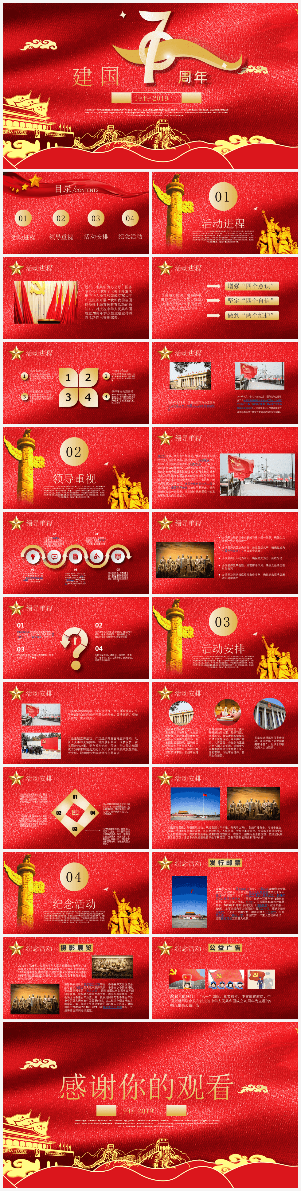 本作品内容为红色中国风布面建国70周年主题活动PPT模板。 格式为 pptx, 大小9MB, 页数为22,比例自定义, 请使用软件PowerPoint打开, 作品中主体文字及图片可替换修改,文字修改可直接点击文本框进行编辑,图片更改可选中图片后单击鼠标右键选择更换图片,也可根据自身需求增加和删除作品中的内容, 源文件无水印, 欢迎使用发发资源库。