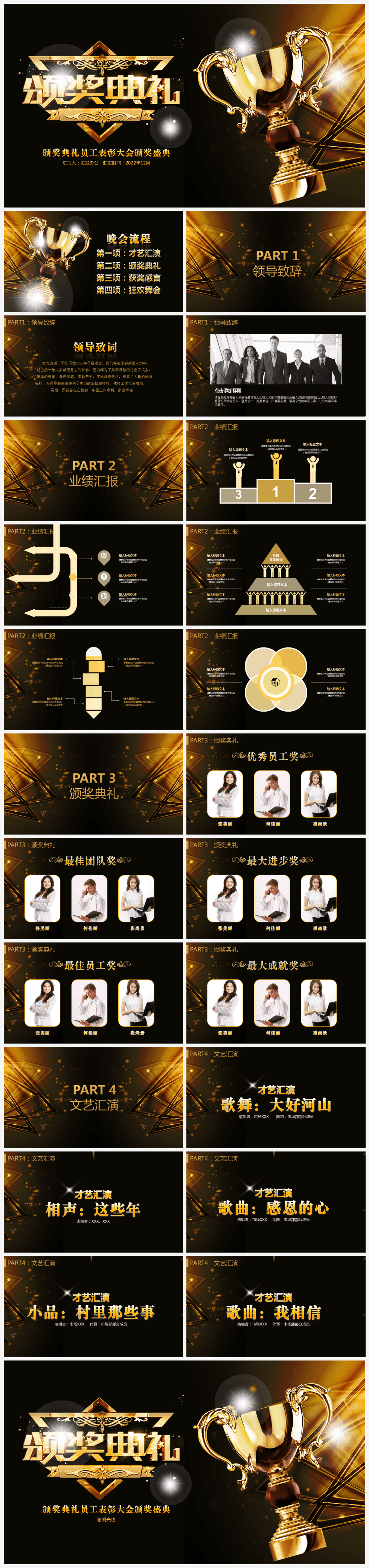 本作品内容为金色奖杯光点颁奖典礼员工表彰大会颁奖盛典PPT模板。 格式为 pptx, 大小13MB, 页数为24,比例自定义, 请使用软件PowerPoint打开, 作品中主体文字及图片可替换修改,文字修改可直接点击文本框进行编辑,图片更改可选中图片后单击鼠标右键选择更换图片,也可根据自身需求增加和删除作品中的内容, 源文件无水印, 欢迎使用发发资源库。