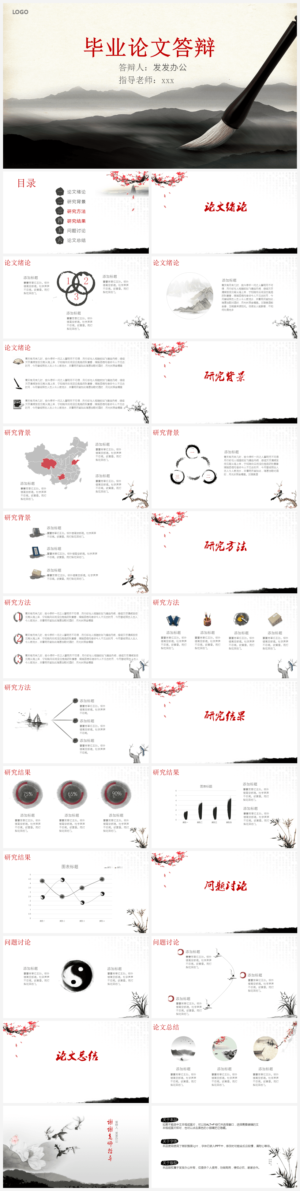 本作品内容为水墨复古风毕业论文答辩PPT模板。 格式为 pptx, 大小7MB, 页数为25,比例自定义, 请使用软件PowerPoint打开, 作品中主体文字及图片可替换修改,文字修改可直接点击文本框进行编辑,图片更改可选中图片后单击鼠标右键选择更换图片,也可根据自身需求增加和删除作品中的内容, 源文件无水印, 欢迎使用发发资源库。