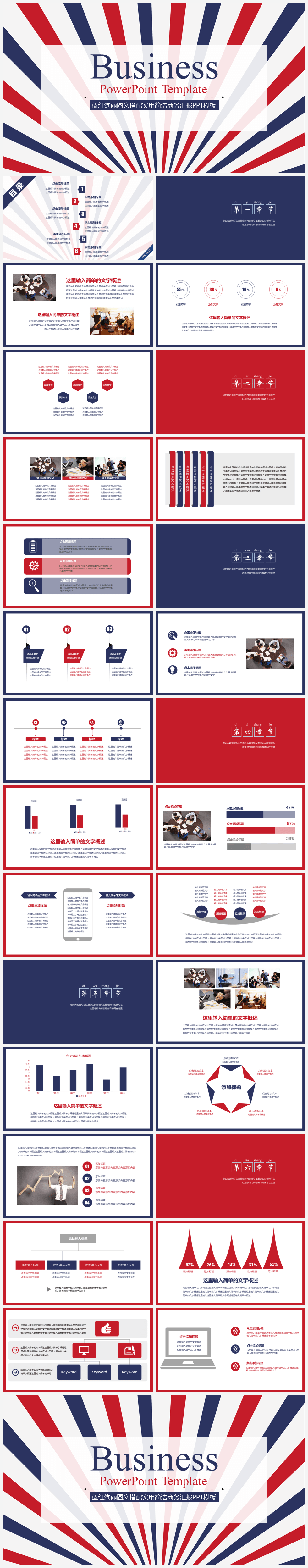 本作品内容为蓝红绚丽图文搭配实用简洁商务汇报PPT模板。 格式为 pptx, 大小2MB, 页数为30,比例自定义, 请使用软件PowerPoint打开, 作品中主体文字及图片可替换修改,文字修改可直接点击文本框进行编辑,图片更改可选中图片后单击鼠标右键选择更换图片,也可根据自身需求增加和删除作品中的内容, 源文件无水印, 欢迎使用发发资源库。