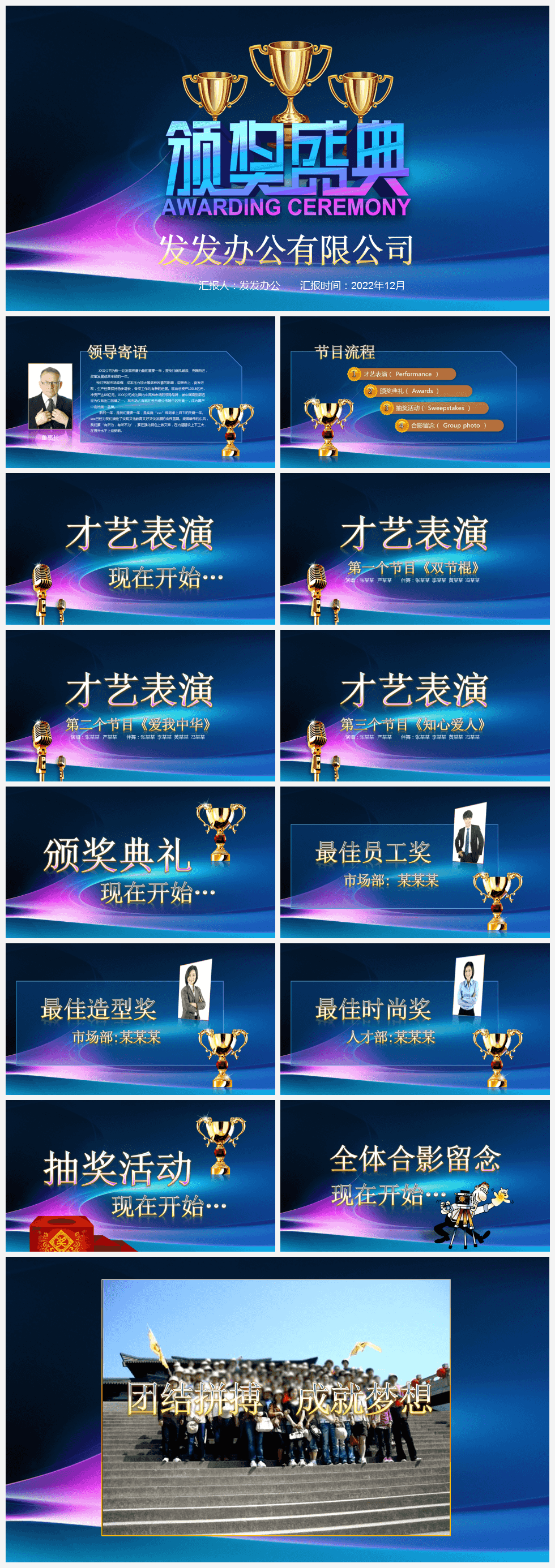 本作品内容为蓝色简约风金色奖杯公司年终晚会颁奖盛典PPT模板。 格式为 pptx, 大小36MB, 页数为14,比例自定义, 请使用软件PowerPoint打开, 作品中主体文字及图片可替换修改,文字修改可直接点击文本框进行编辑,图片更改可选中图片后单击鼠标右键选择更换图片,也可根据自身需求增加和删除作品中的内容, 源文件无水印, 欢迎使用发发资源库。 资源下载此资源下载价格为8.8F币,VIP免费,请先登录