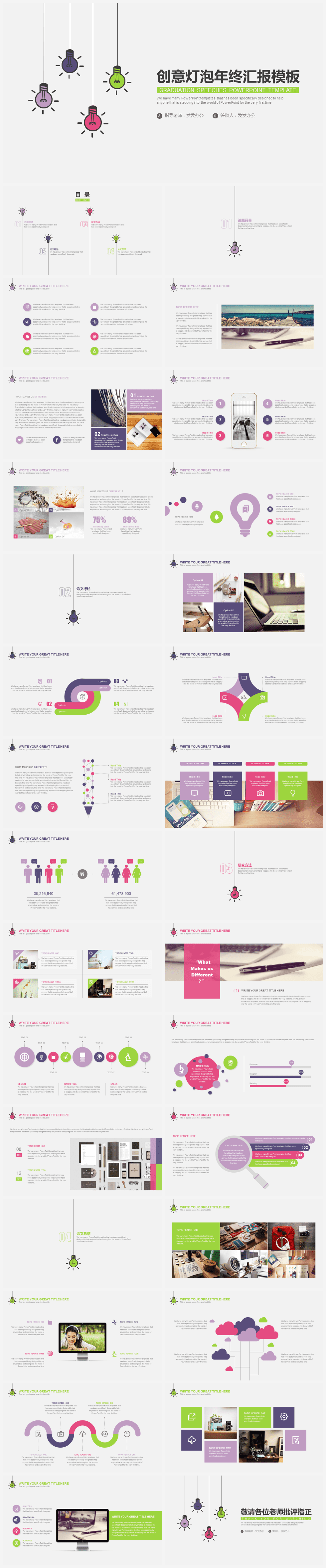 本作品内容为多彩简约风创意灯泡年终汇报PPT模板。 格式为 pptx, 大小6MB, 页数为31,比例自定义, 请使用软件PowerPoint打开, 作品中主体文字及图片可替换修改,文字修改可直接点击文本框进行编辑,图片更改可选中图片后单击鼠标右键选择更换图片,也可根据自身需求增加和删除作品中的内容, 源文件无水印, 欢迎使用发发资源库。