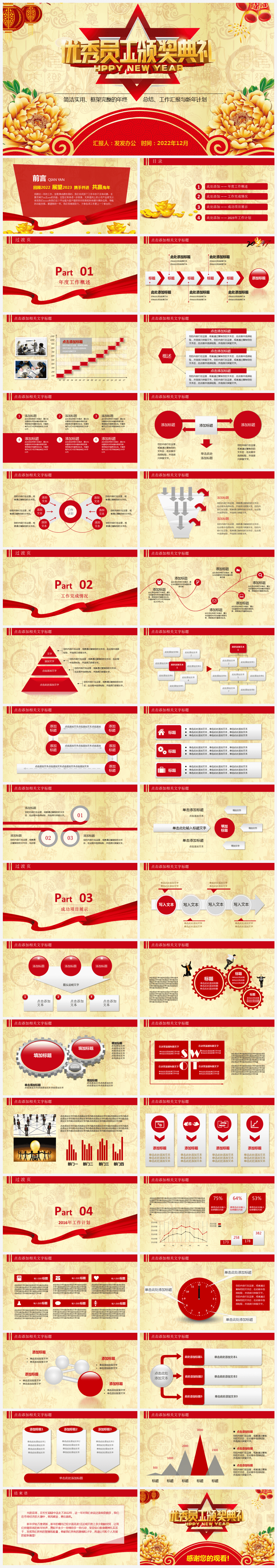 本作品内容为红色中国风优秀员工颁奖典礼年终总结PPT模板。 格式为 pptx, 大小13MB, 页数为37,比例自定义, 请使用软件PowerPoint打开, 作品中主体文字及图片可替换修改,文字修改可直接点击文本框进行编辑,图片更改可选中图片后单击鼠标右键选择更换图片,也可根据自身需求增加和删除作品中的内容, 源文件无水印, 欢迎使用发发资源库。 资源下载此资源下载价格为8.8F币,VIP免费,请先登录