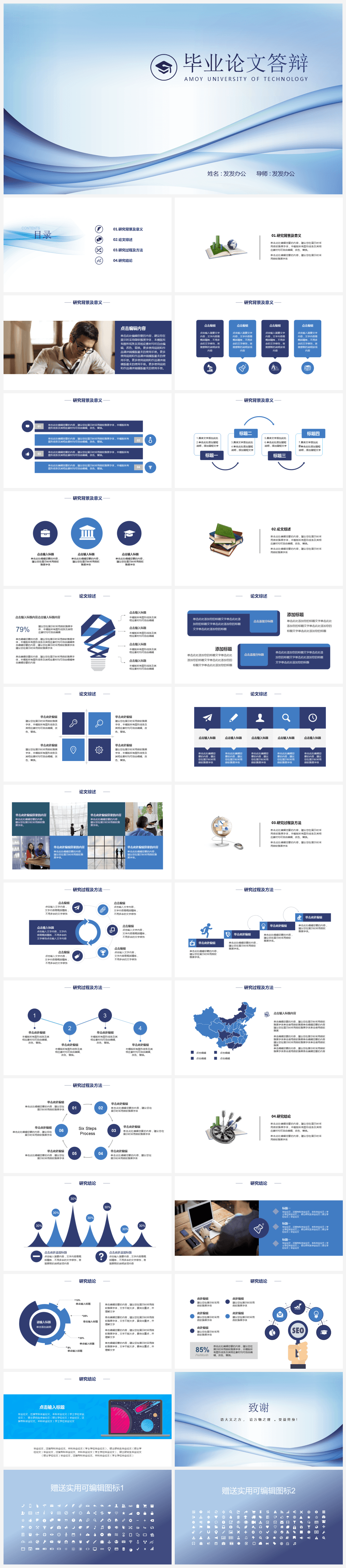 本作品内容为蓝色简约风毕业论文答辩PPT模板。 格式为 pptx, 大小6MB, 页数为29,比例自定义, 请使用软件PowerPoint打开, 作品中主体文字及图片可替换修改,文字修改可直接点击文本框进行编辑,图片更改可选中图片后单击鼠标右键选择更换图片,也可根据自身需求增加和删除作品中的内容, 源文件无水印, 欢迎使用发发资源库。