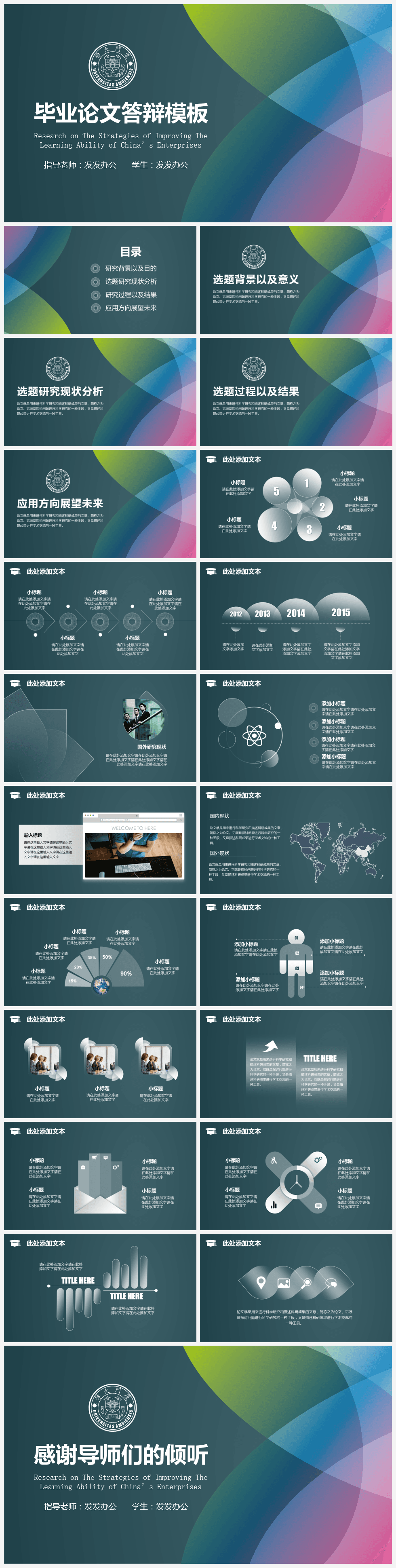 本作品内容为提高企业学习能力的研究抽象毕业论文答辩PPT模板。 格式为 pptx, 大小2MB, 页数为22,比例自定义, 请使用软件PowerPoint打开, 作品中主体文字及图片可替换修改,文字修改可直接点击文本框进行编辑,图片更改可选中图片后单击鼠标右键选择更换图片,也可根据自身需求增加和删除作品中的内容, 源文件无水印, 欢迎使用发发资源库。