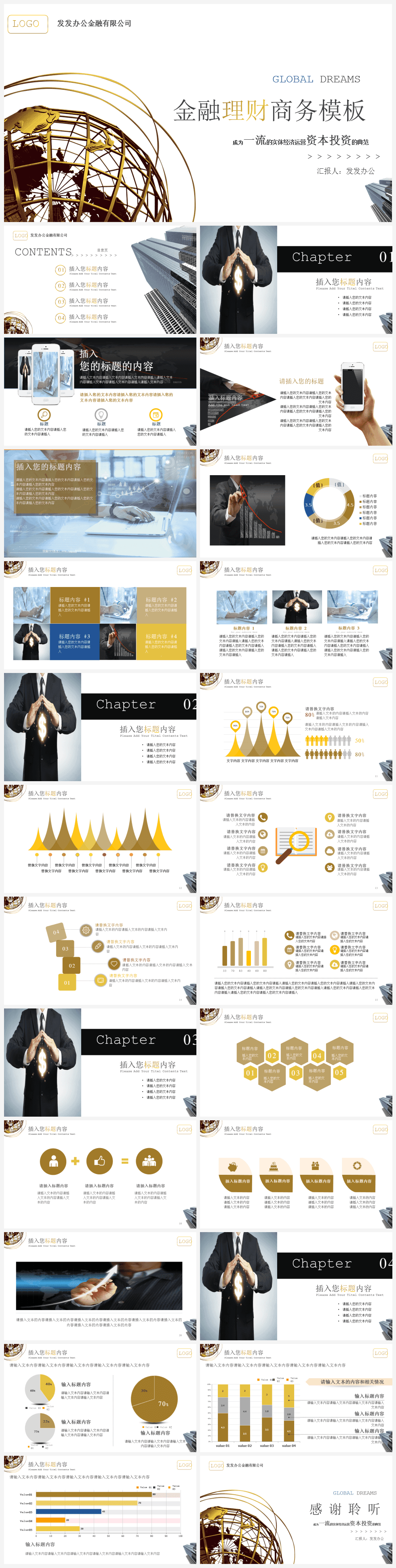 本作品内容为金色欧美风金融理财商务通用PPT模板。 格式为 pptx, 大小30MB, 页数为25,比例自定义, 请使用软件PowerPoint打开, 作品中主体文字及图片可替换修改,文字修改可直接点击文本框进行编辑,图片更改可选中图片后单击鼠标右键选择更换图片,也可根据自身需求增加和删除作品中的内容, 源文件无水印, 欢迎使用发发资源库。