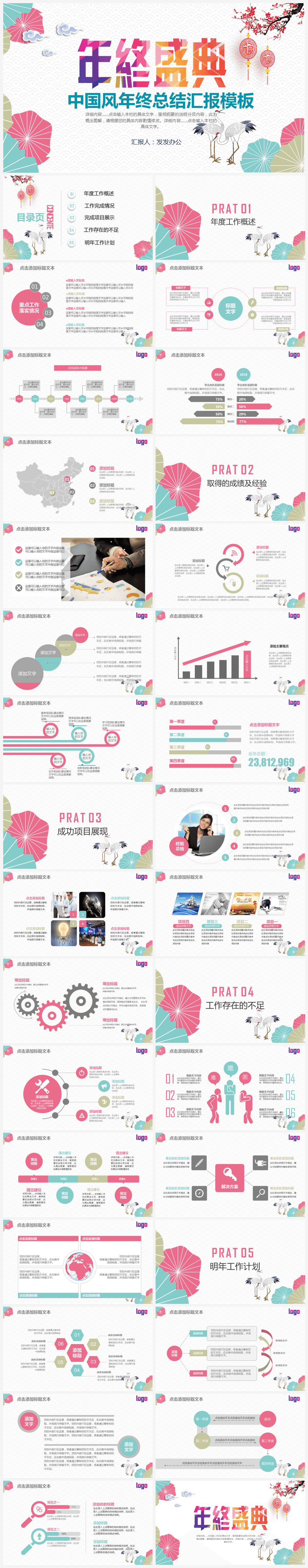 本作品内容为多彩中国风年终总结汇报PPT模板。 格式为 pptx, 大小13MB, 页数为33,比例自定义, 请使用软件PowerPoint打开, 作品中主体文字及图片可替换修改,文字修改可直接点击文本框进行编辑,图片更改可选中图片后单击鼠标右键选择更换图片,也可根据自身需求增加和删除作品中的内容, 源文件无水印, 欢迎使用发发资源库。