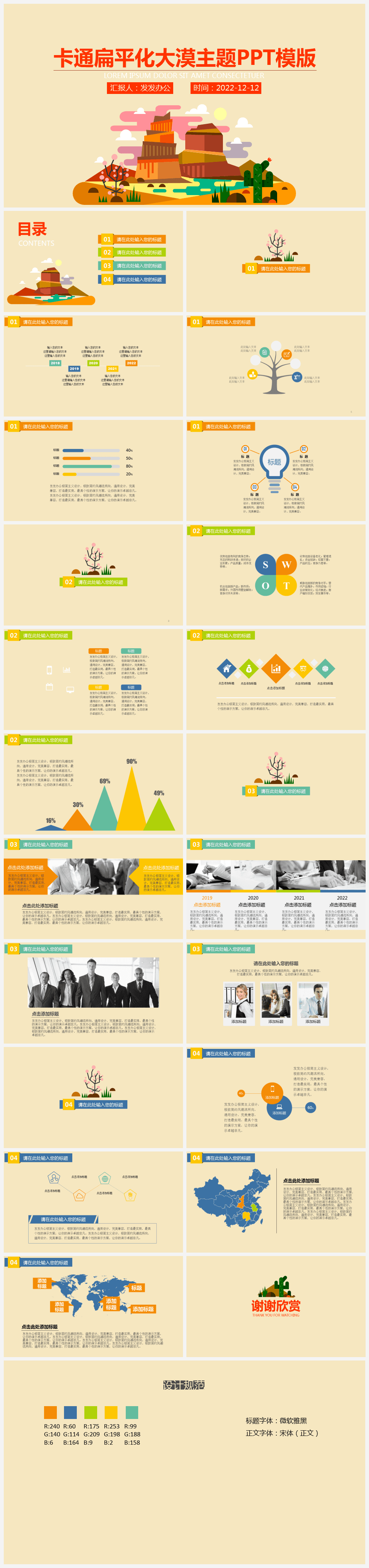本作品内容为粉色卡通扁平化大漠主题PPT模版。 格式为 pptx, 大小3MB, 页数为24,比例自定义, 请使用软件PowerPoint打开, 作品中主体文字及图片可替换修改,文字修改可直接点击文本框进行编辑,图片更改可选中图片后单击鼠标右键选择更换图片,也可根据自身需求增加和删除作品中的内容, 源文件无水印, 欢迎使用发发资源库。