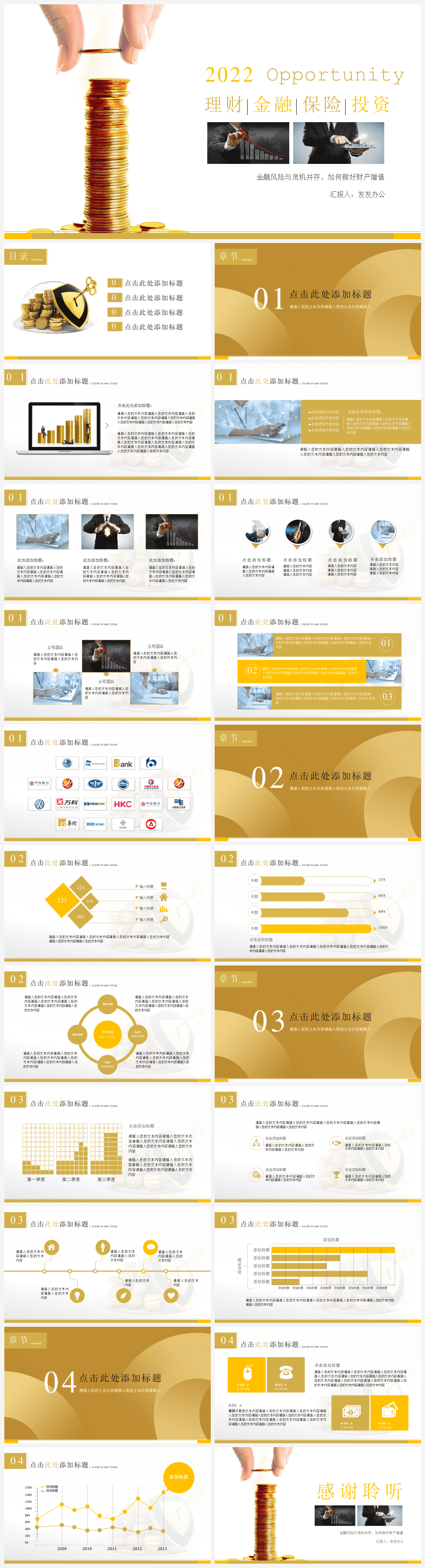 本作品内容为金色欧美风理财金融保险投资通用PPT模板。 格式为 pptx, 大小36MB, 页数为23,比例自定义, 请使用软件PowerPoint打开, 作品中主体文字及图片可替换修改,文字修改可直接点击文本框进行编辑,图片更改可选中图片后单击鼠标右键选择更换图片,也可根据自身需求增加和删除作品中的内容, 源文件无水印, 欢迎使用发发资源库。