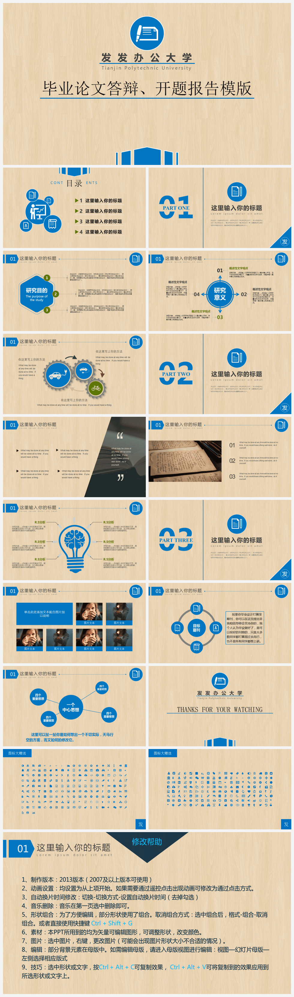 本作品内容为蓝色简约风木纹毕业论文答辩开题报告PPT模板。 格式为 ppt, 大小3MB, 页数为18,比例自定义, 请使用软件PowerPoint打开, 作品中主体文字及图片可替换修改,文字修改可直接点击文本框进行编辑,图片更改可选中图片后单击鼠标右键选择更换图片,也可根据自身需求增加和删除作品中的内容, 源文件无水印, 欢迎使用发发资源库。