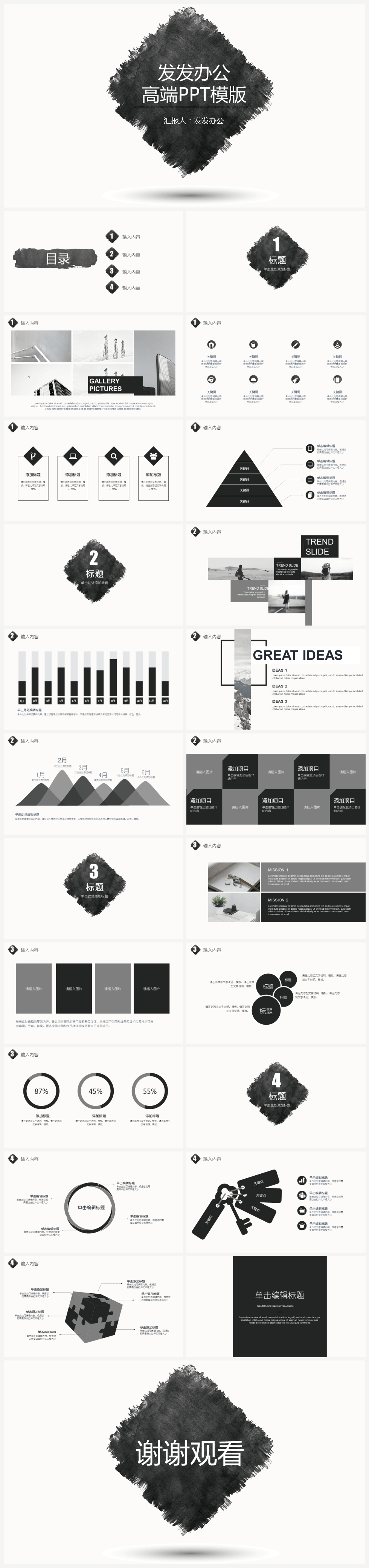 本作品内容为水墨简约风产品介绍品牌推广PPT模板。 格式为 pptx, 大小3MB, 页数为24,比例自定义, 请使用软件PowerPoint打开, 作品中主体文字及图片可替换修改,文字修改可直接点击文本框进行编辑,图片更改可选中图片后单击鼠标右键选择更换图片,也可根据自身需求增加和删除作品中的内容, 源文件无水印, 欢迎使用发发资源库。