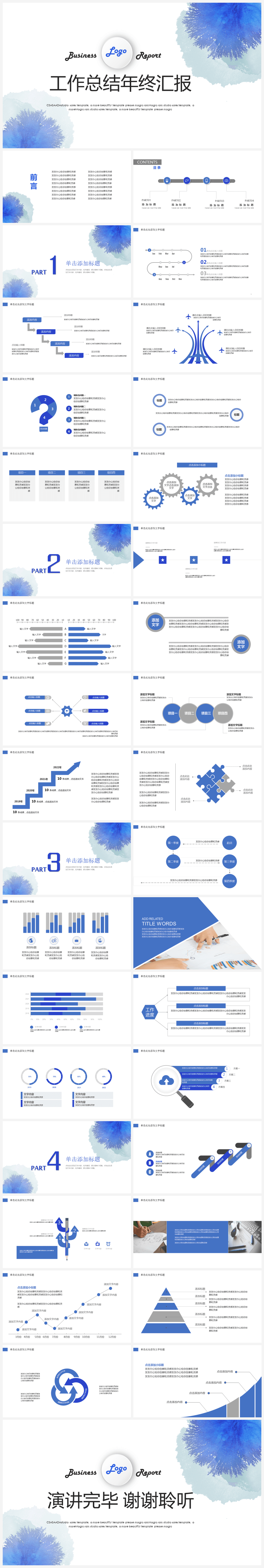 本作品内容为蓝色水墨简约风工作总结年终汇报PPT模板。 格式为 pptx, 大小17MB, 页数为36,比例自定义, 请使用软件PowerPoint打开, 作品中主体文字及图片可替换修改,文字修改可直接点击文本框进行编辑,图片更改可选中图片后单击鼠标右键选择更换图片,也可根据自身需求增加和删除作品中的内容, 源文件无水印, 欢迎使用发发资源库。