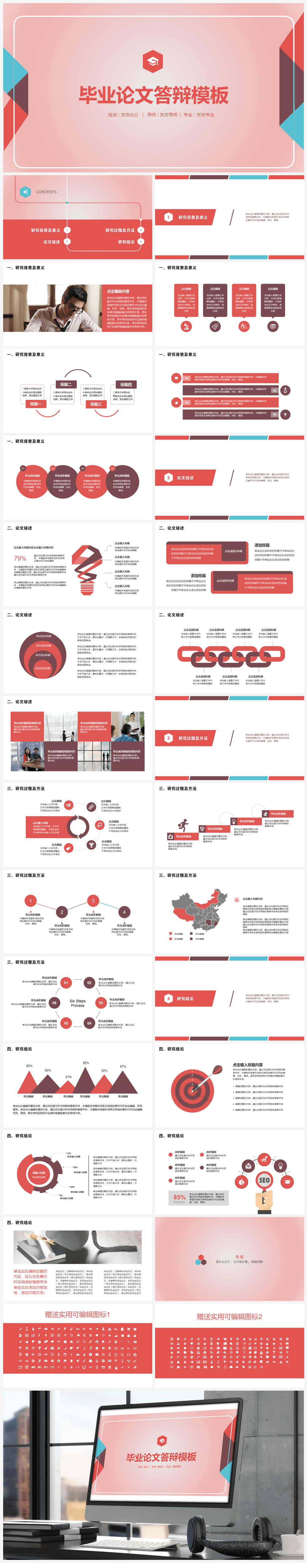 本作品内容为大气简约风多彩毕业论文答辩PPT模板。 格式为 pptx, 大小2MB, 页数为30,比例自定义, 请使用软件PowerPoint打开, 作品中主体文字及图片可替换修改,文字修改可直接点击文本框进行编辑,图片更改可选中图片后单击鼠标右键选择更换图片,也可根据自身需求增加和删除作品中的内容, 源文件无水印, 欢迎使用发发资源库。