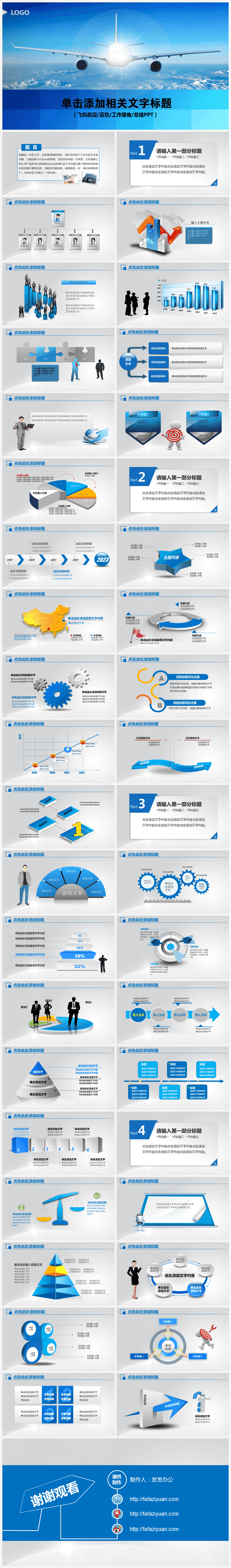 本作品内容为蓝色飞机航空商务工作汇报PPT模板。 格式为 pptx, 大小7MB, 页数为42,比例自定义, 请使用软件PowerPoint打开, 作品中主体文字及图片可替换修改,文字修改可直接点击文本框进行编辑,图片更改可选中图片后单击鼠标右键选择更换图片,也可根据自身需求增加和删除作品中的内容, 源文件无水印, 欢迎使用发发资源库。