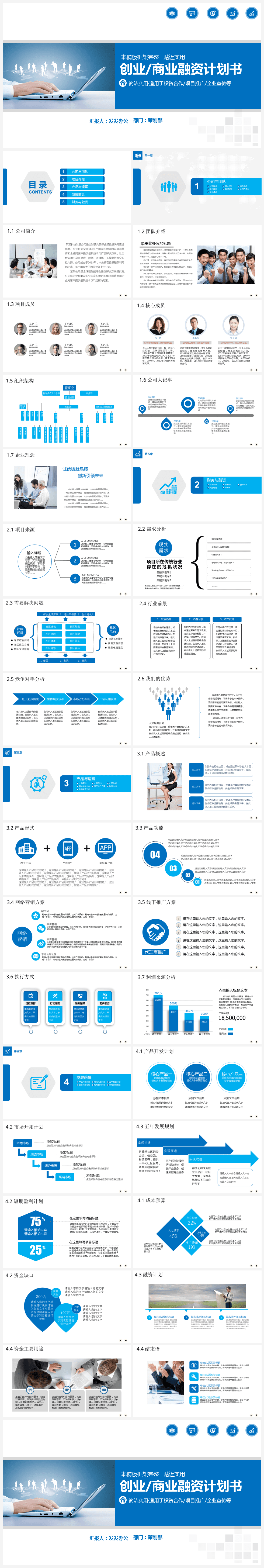 本作品内容为蓝色欧美风创业商业融资计划书PPT模板。 格式为 pptx, 大小8MB, 页数为36,比例自定义, 请使用软件PowerPoint打开, 作品中主体文字及图片可替换修改,文字修改可直接点击文本框进行编辑,图片更改可选中图片后单击鼠标右键选择更换图片,也可根据自身需求增加和删除作品中的内容, 源文件无水印, 欢迎使用发发资源库。