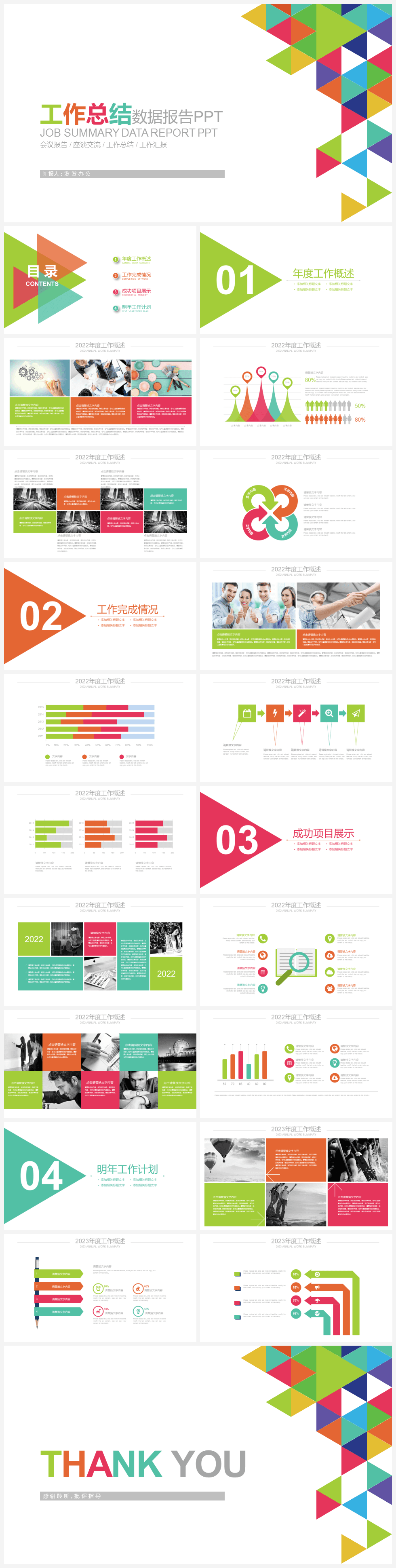 本作品内容为多彩简约风创意三角形工作总结数据报告PPT模板。 格式为 pptx, 大小6MB, 页数为22,比例自定义, 请使用软件PowerPoint打开, 作品中主体文字及图片可替换修改,文字修改可直接点击文本框进行编辑,图片更改可选中图片后单击鼠标右键选择更换图片,也可根据自身需求增加和删除作品中的内容, 源文件无水印, 欢迎使用发发资源库。