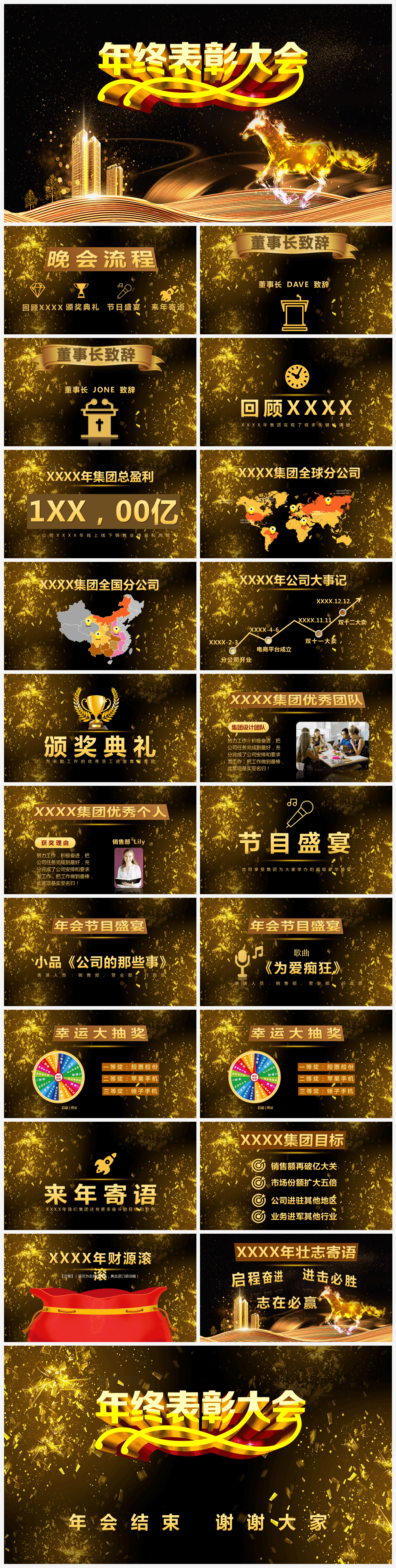 本作品内容为黑金酷炫金马公司年终表彰大会PPT模板。 格式为 pptx, 大小10MB, 页数为22,比例自定义, 请使用软件PowerPoint打开, 作品中主体文字及图片可替换修改,文字修改可直接点击文本框进行编辑,图片更改可选中图片后单击鼠标右键选择更换图片,也可根据自身需求增加和删除作品中的内容, 源文件无水印, 欢迎使用发发资源库。