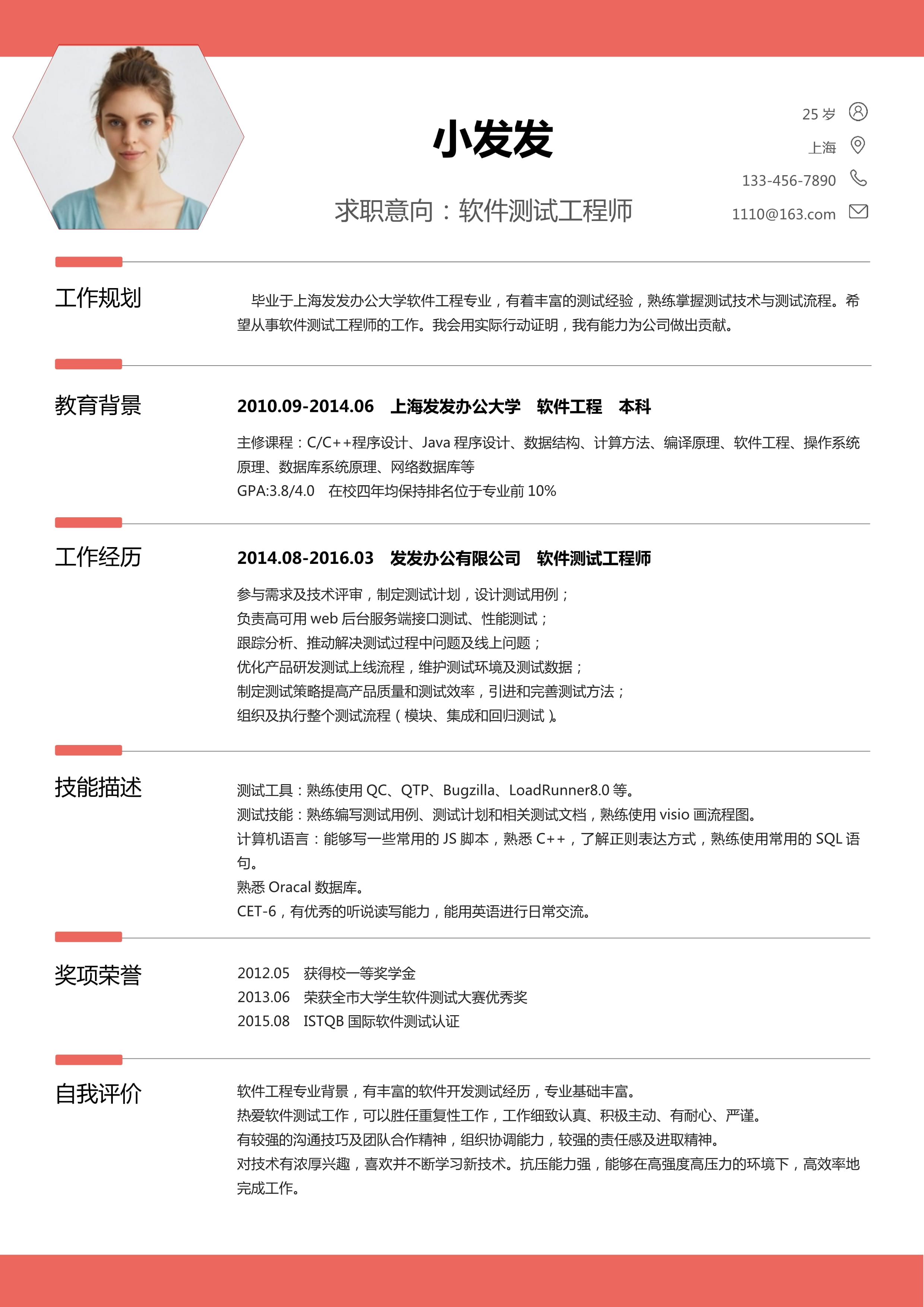 本作品内容为粉色经典风格软件测试求职简历word简历模板, 格式为 docx, 大小1 MB, 页数为1, 请使用软件Word打开, 作品中主体文字及图片可替换修改,文字修改可直接点击文本框进行编辑,图片更改可选中图片后单击鼠标右键选择更换图片,也可根据自身需求增加和删除作品中的内容, 源文件无水印, 欢迎使用发发资源库。