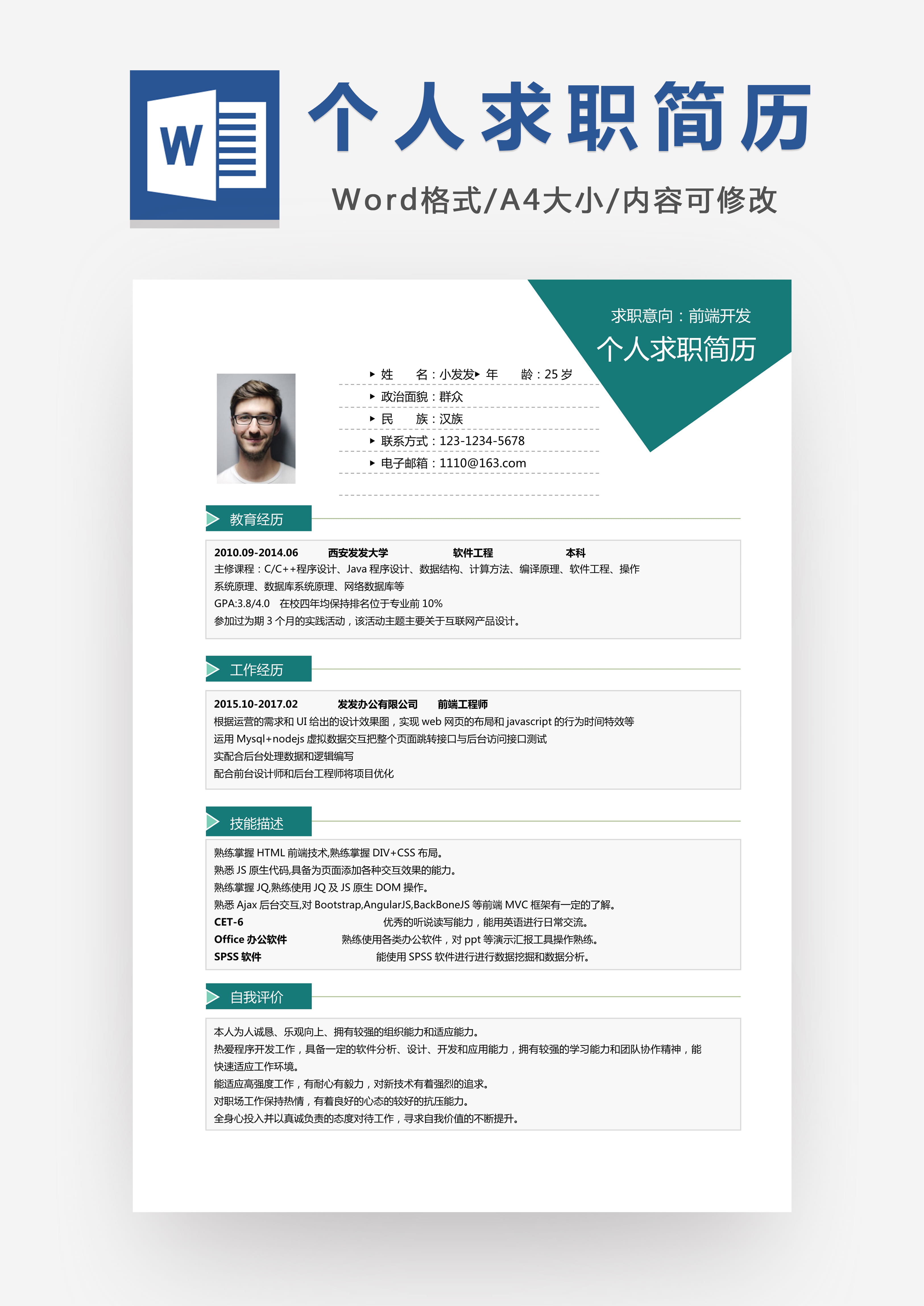 本作品内容为现代风格应届生新媒体运营求职简历word简历模板, 格式为 docx, 大小1 MB, 页数为1, 请使用软件Word打开, 作品中主体文字及图片可替换修改,文字修改可直接点击文本框进行编辑,图片更改可选中图片后单击鼠标右键选择更换图片,也可根据自身需求增加和删除作品中的内容, 源文件无水印, 欢迎使用发发资源库。 资源下载此资源下载价格为8.8F币,VIP免费,请先登录