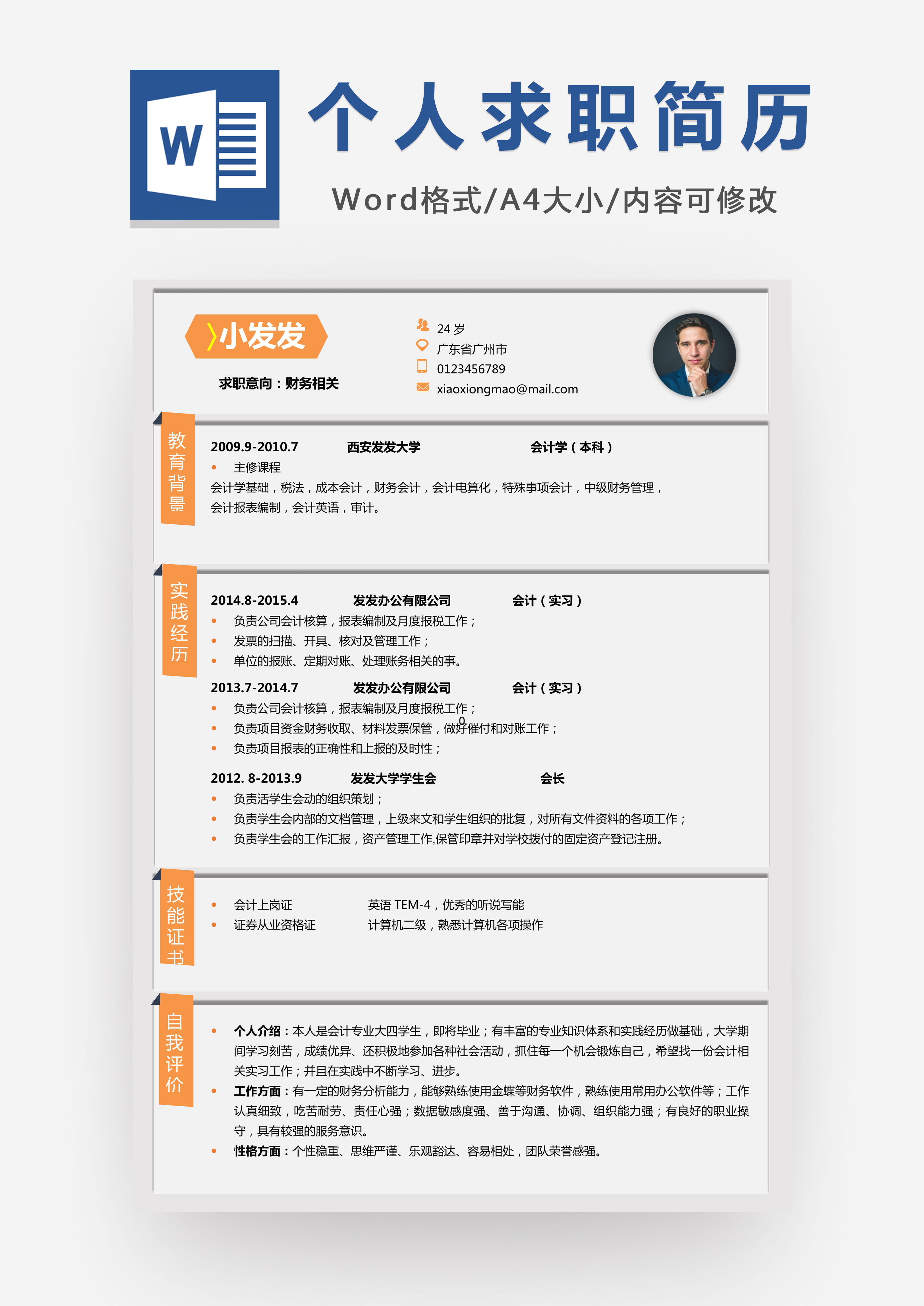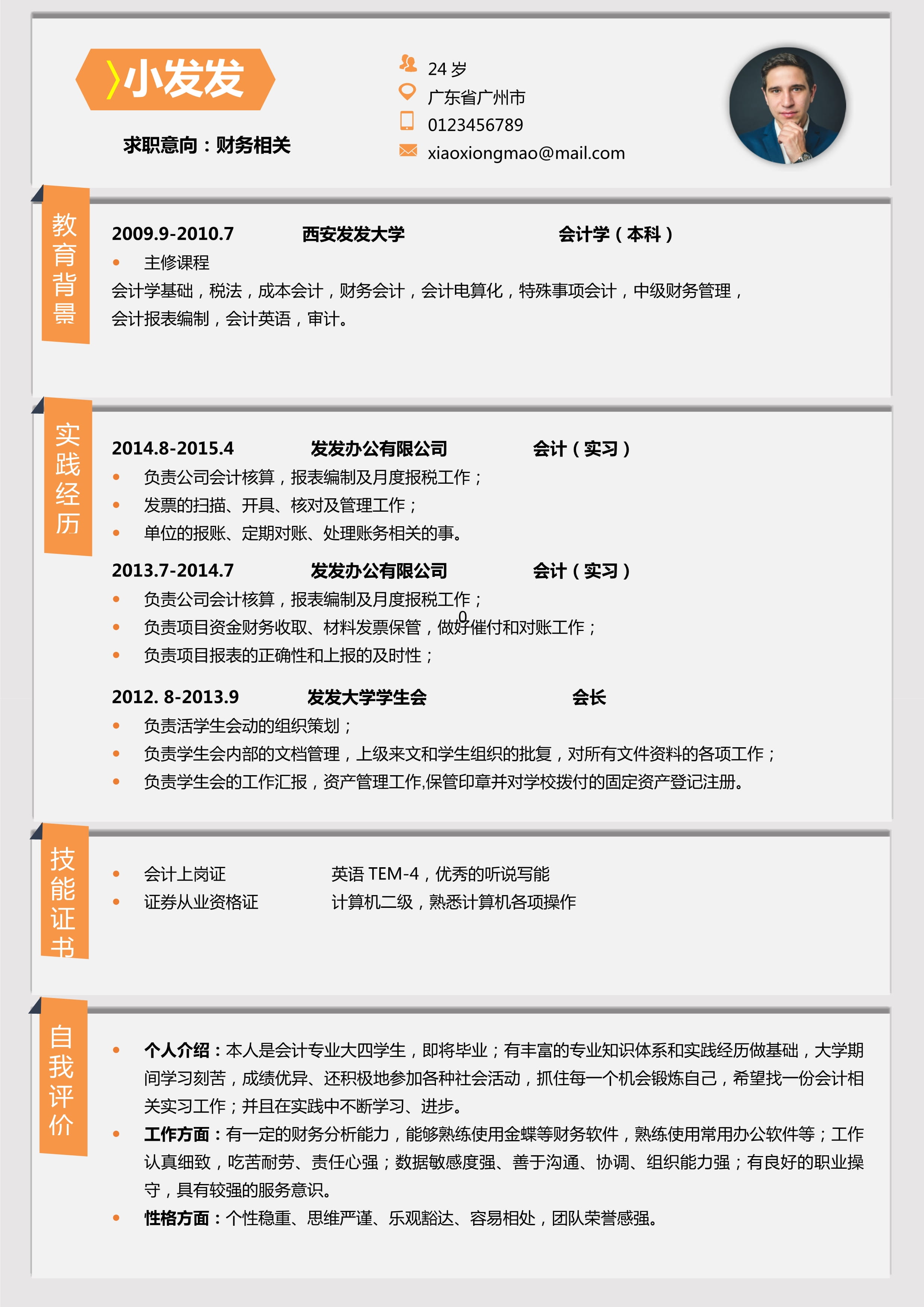 本作品内容为橙色小清新财务个人求职简历word简历模板, 格式为 docx, 大小1 MB, 页数为1, 请使用软件Word打开, 作品中主体文字及图片可替换修改,文字修改可直接点击文本框进行编辑,图片更改可选中图片后单击鼠标右键选择更换图片,也可根据自身需求增加和删除作品中的内容, 源文件无水印, 欢迎使用发发资源库。