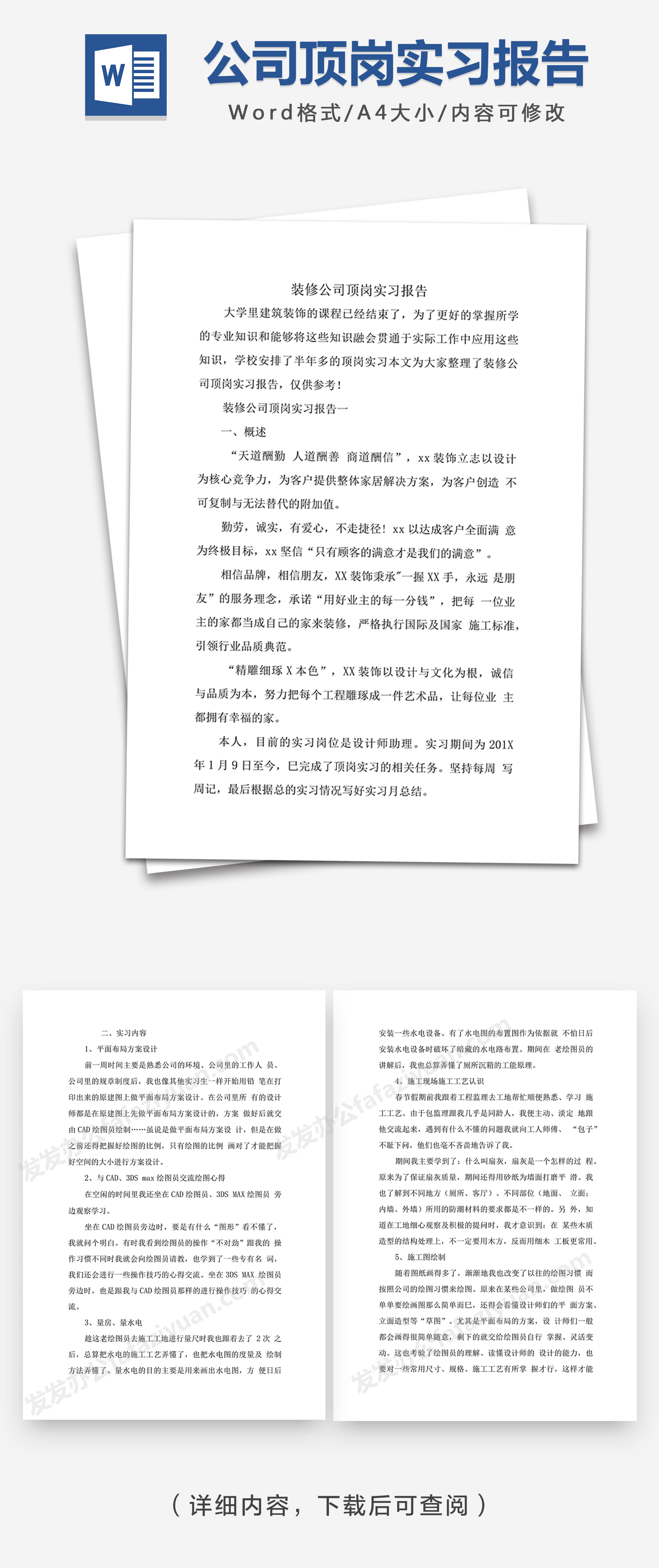 本作品内容为装修公司顶岗实习报告Word模, 格式为 docx, 大小1 MB, 页数为16, 请使用软件Word打开, 作品中主体文字及图片可替换修改,文字修改可直接点击文本框进行编辑,图片更改可选中图片后单击鼠标右键选择更换图片,也可根据自身需求增加和删除作品中的内容, 源文件无水印, 欢迎使用发发资源库。