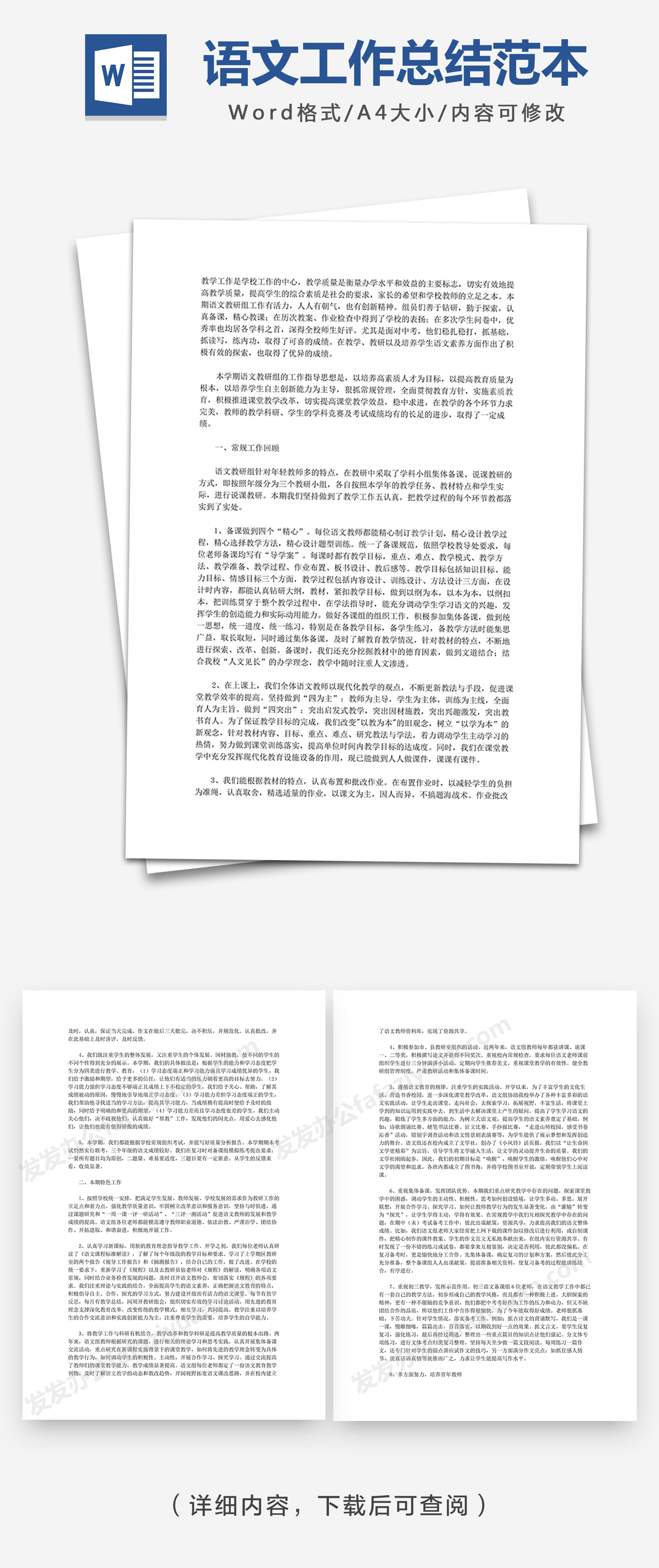 本作品内容为语文教研组工作总结范本Word模板, 格式为 doc, 大小1 MB, 页数为4, 请使用软件Word打开, 作品中主体文字及图片可替换修改,文字修改可直接点击文本框进行编辑,图片更改可选中图片后单击鼠标右键选择更换图片,也可根据自身需求增加和删除作品中的内容, 源文件无水印, 欢迎使用发发资源库。 资源下载此资源下载价格为8.8F币,VIP免费,请先登录
