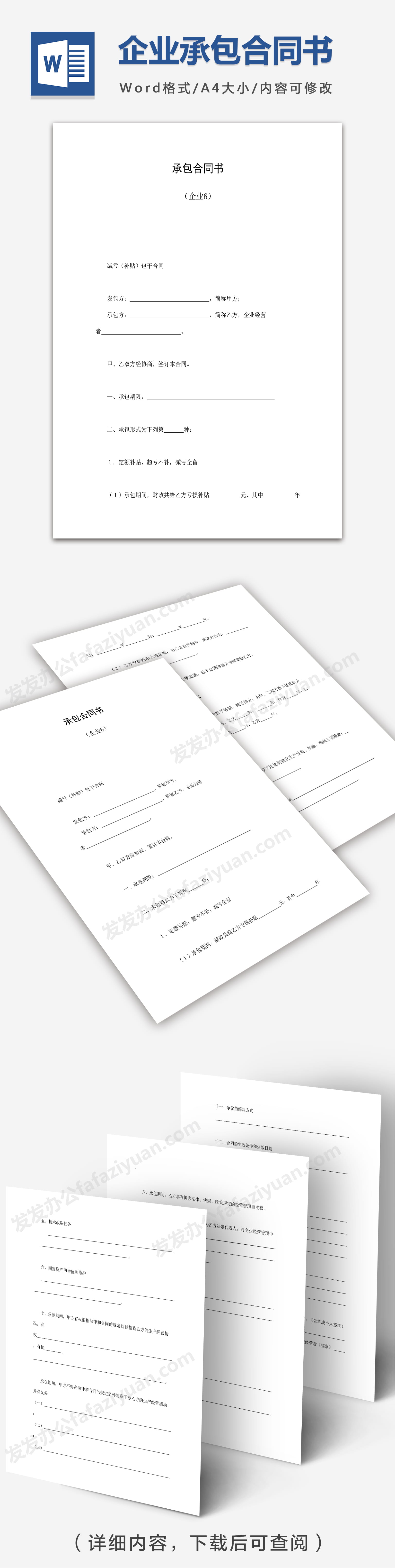 本作品内容为企业承包减亏(补贴)包干合同, 格式为 doc, 大小1 MB, 页数为6, 请使用软件Word打开, 作品中主体文字及图片可替换修改,文字修改可直接点击文本框进行编辑,图片更改可选中图片后单击鼠标右键选择更换图片,也可根据自身需求增加和删除作品中的内容, 源文件无水印, 欢迎使用发发资源库。 资源下载此资源下载价格为8.8F币,VIP免费,请先登录