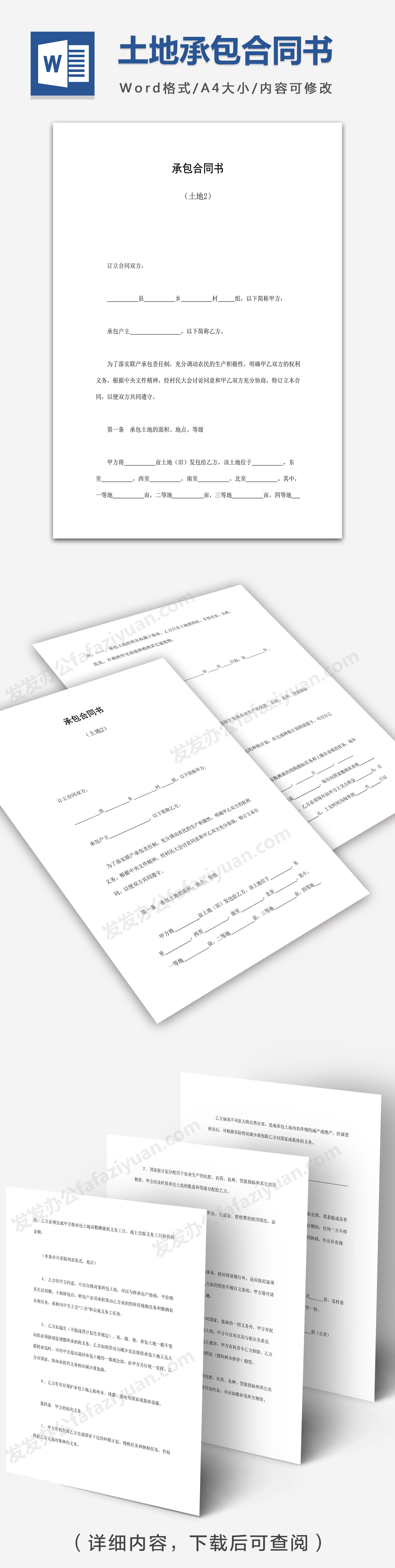 本作品内容为土地承包合同书, 格式为 doc, 大小1 MB, 页数为6, 请使用软件Word打开, 作品中主体文字及图片可替换修改,文字修改可直接点击文本框进行编辑,图片更改可选中图片后单击鼠标右键选择更换图片,也可根据自身需求增加和删除作品中的内容, 源文件无水印, 欢迎使用发发资源库。
