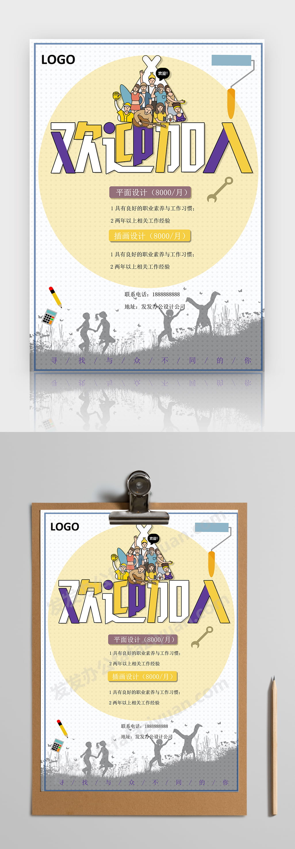 本作品内容为平面设计插画设计招聘海报单页Word模板, 格式为 docx, 大小1 MB, 页数为1, 请使用软件Word打开, 作品中主体文字及图片可替换修改,文字修改可直接点击文本框进行编辑,图片更改可选中图片后单击鼠标右键选择更换图片,也可根据自身需求增加和删除作品中的内容, 源文件无水印, 欢迎使用发发资源库。 资源下载此资源下载价格为8.8F币,VIP免费,请先登录