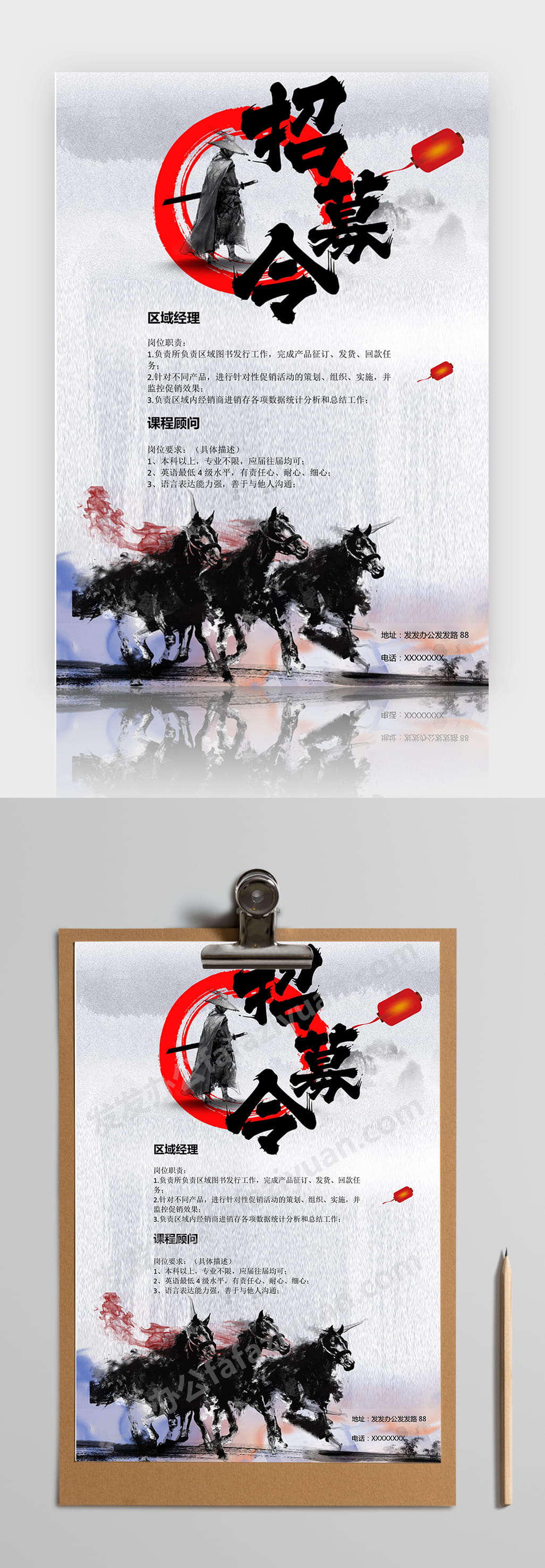 本作品内容为水墨复古风招募令招聘海报Word模板, 格式为 docx, 大小1 MB, 页数为1, 请使用软件Word打开, 作品中主体文字及图片可替换修改,文字修改可直接点击文本框进行编辑,图片更改可选中图片后单击鼠标右键选择更换图片,也可根据自身需求增加和删除作品中的内容, 源文件无水印, 欢迎使用发发资源库。 资源下载此资源下载价格为8.8F币,VIP免费,请先登录