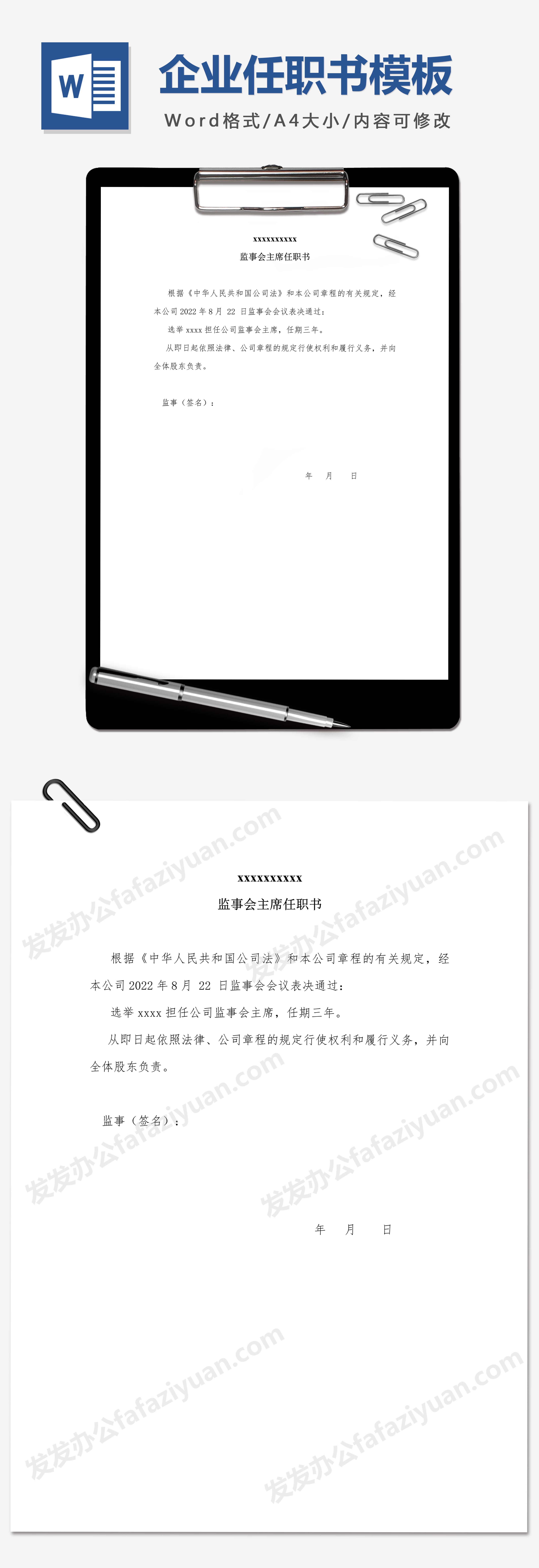 本作品内容为公司法人代表、董事、经理、监事任职文件, 格式为 doc, 大小1MB, 页数为1, 请使用软件Word打开, 作品中主体文字及图片可替换修改,文字修改可直接点击文本框进行编辑,图片更改可选中图片后单击鼠标右键选择更换图片,也可根据自身需求增加和删除作品中的内容, 源文件无水印, 欢迎使用发发资源库。