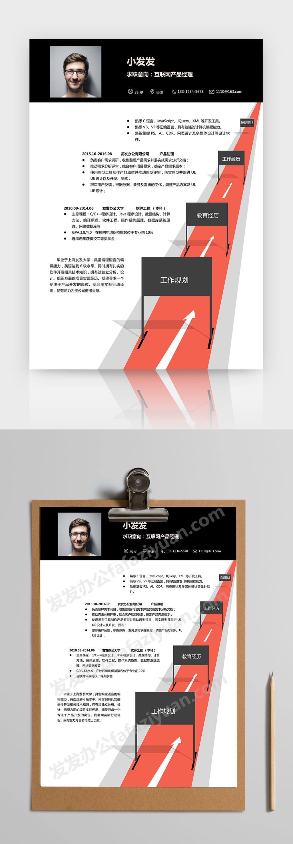 本作品内容为创意个性互联网产品经理求职简历word简历模板, 格式为 docx, 大小1 MB, 页数为1, 请使用软件Word打开, 作品中主体文字及图片可替换修改,文字修改可直接点击文本框进行编辑,图片更改可选中图片后单击鼠标右键选择更换图片,也可根据自身需求增加和删除作品中的内容, 源文件无水印, 欢迎使用发发资源库。