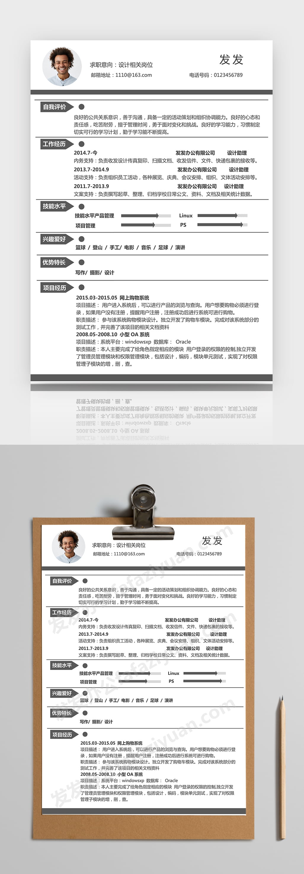 本作品内容为灰色小清新设计师简历word简历, 格式为 docx, 大小1 MB, 页数为1, 请使用软件Word打开, 作品中主体文字及图片可替换修改,文字修改可直接点击文本框进行编辑,图片更改可选中图片后单击鼠标右键选择更换图片,也可根据自身需求增加和删除作品中的内容, 源文件无水印, 欢迎使用发发资源库。