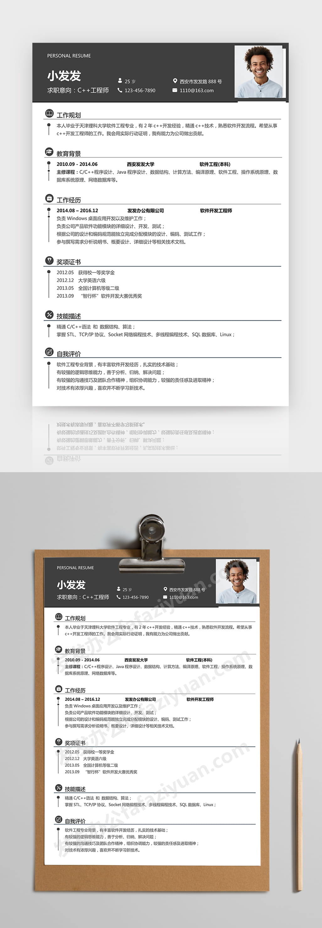 本作品内容为深灰色经典风格C工程师求职简历word简历模板, 格式为 docx, 大小1 MB, 页数为1, 请使用软件Word打开, 作品中主体文字及图片可替换修改,文字修改可直接点击文本框进行编辑,图片更改可选中图片后单击鼠标右键选择更换图片,也可根据自身需求增加和删除作品中的内容, 源文件无水印, 欢迎使用发发资源库。