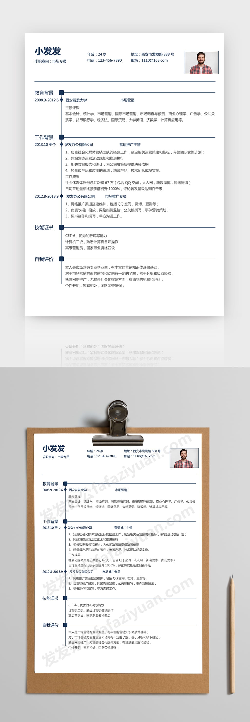 本作品内容为简约白色系市场专员求职简历word简历模板, 格式为 docx, 大小1 MB, 页数为1, 请使用软件Word打开, 作品中主体文字及图片可替换修改,文字修改可直接点击文本框进行编辑,图片更改可选中图片后单击鼠标右键选择更换图片,也可根据自身需求增加和删除作品中的内容, 源文件无水印, 欢迎使用发发资源库。