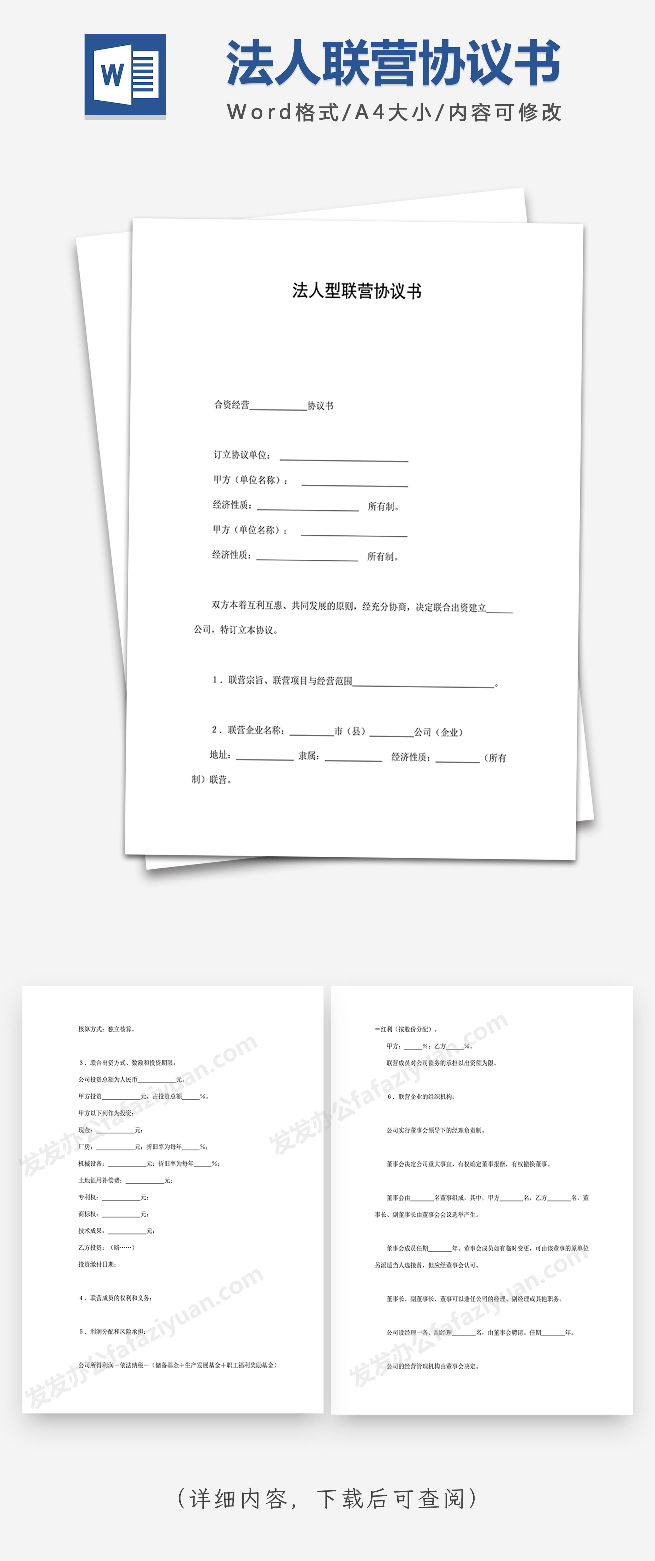 本作品内容为法人型联营协议书, 格式为 doc, 大小1MB, 页数为5, 请使用软件Word打开, 作品中主体文字及图片可替换修改,文字修改可直接点击文本框进行编辑,图片更改可选中图片后单击鼠标右键选择更换图片,也可根据自身需求增加和删除作品中的内容, 源文件无水印, 欢迎使用发发资源库。