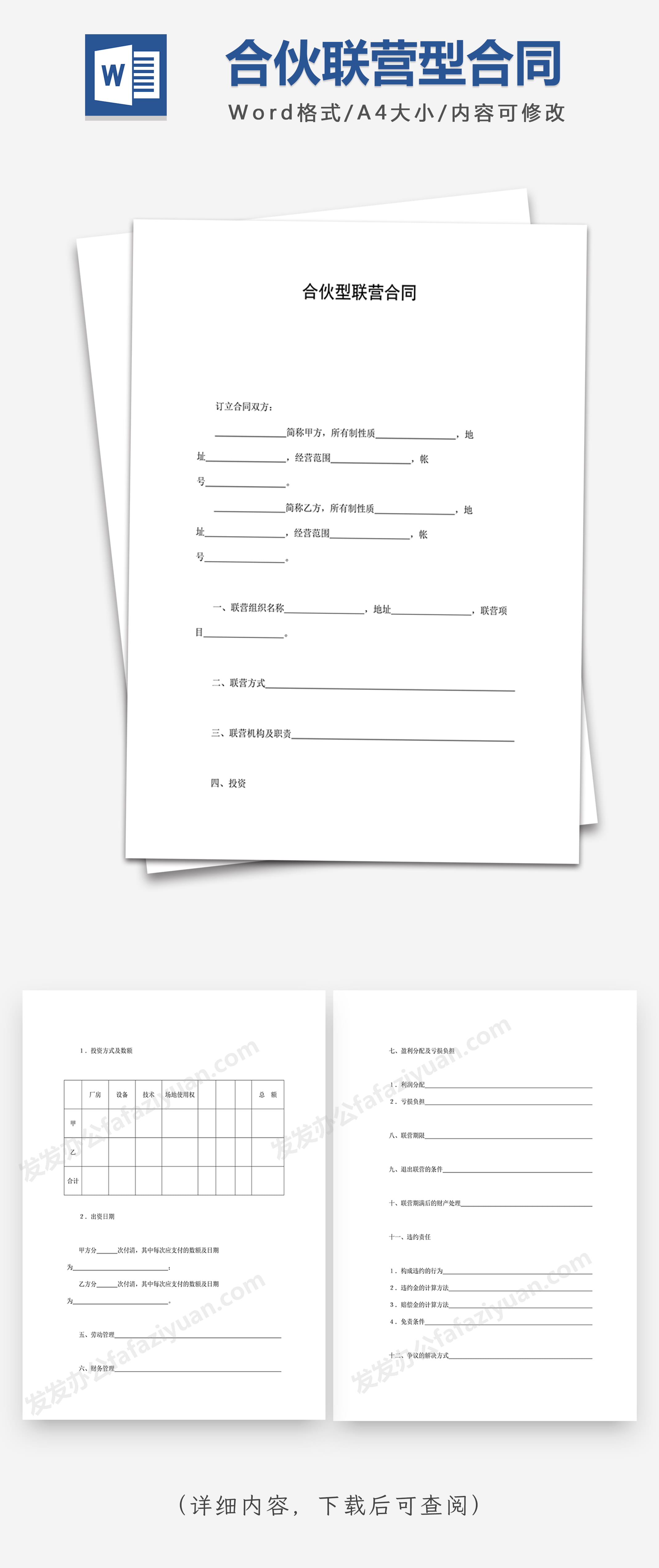 本作品内容为合伙型联营合同Word合同范本, 格式为 doc, 大小1MB, 页数为4, 请使用软件Word打开, 作品中主体文字及图片可替换修改,文字修改可直接点击文本框进行编辑,图片更改可选中图片后单击鼠标右键选择更换图片,也可根据自身需求增加和删除作品中的内容, 源文件无水印, 欢迎使用发发资源库。 资源下载此资源下载价格为8.8F币,VIP免费,请先登录