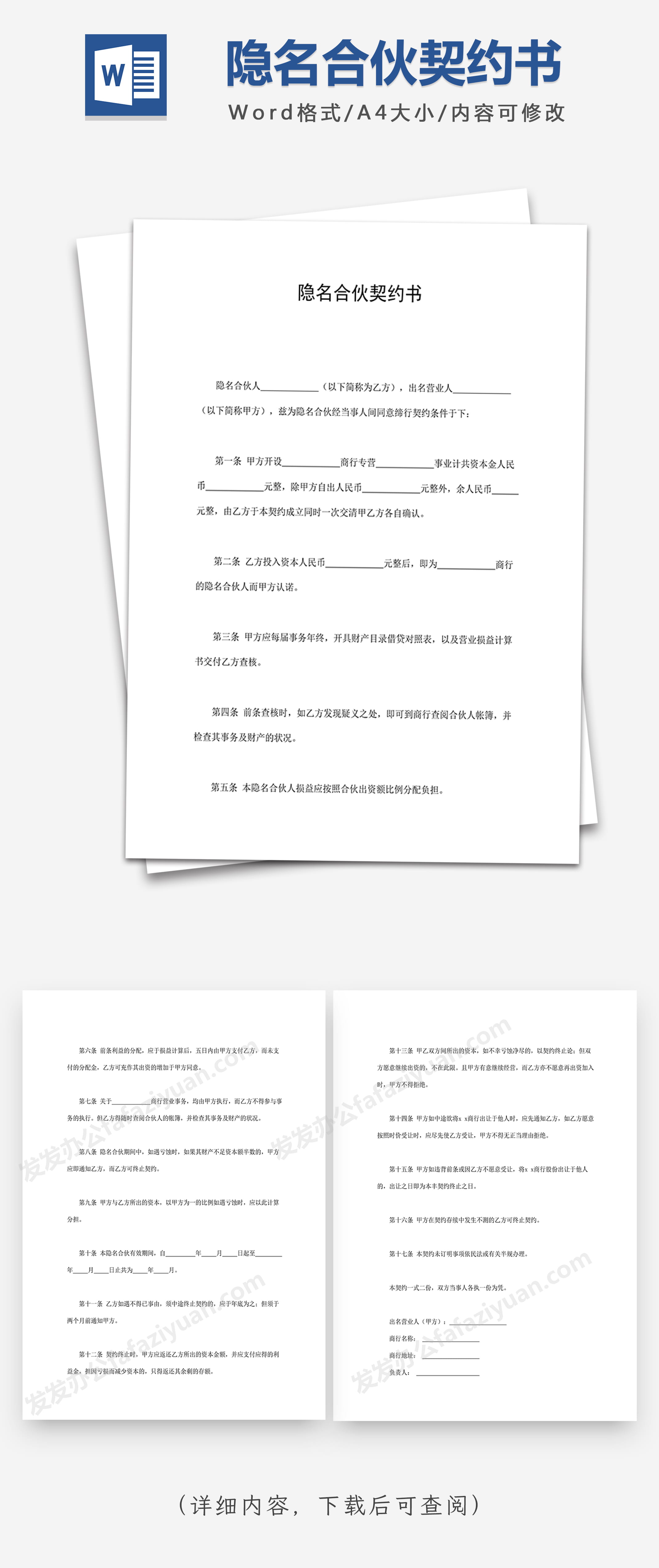 本作品内容为隐名合伙契约书, 格式为 doc, 大小1MB, 页数为4, 请使用软件Word打开, 作品中主体文字及图片可替换修改,文字修改可直接点击文本框进行编辑,图片更改可选中图片后单击鼠标右键选择更换图片,也可根据自身需求增加和删除作品中的内容, 源文件无水印, 欢迎使用发发资源库。