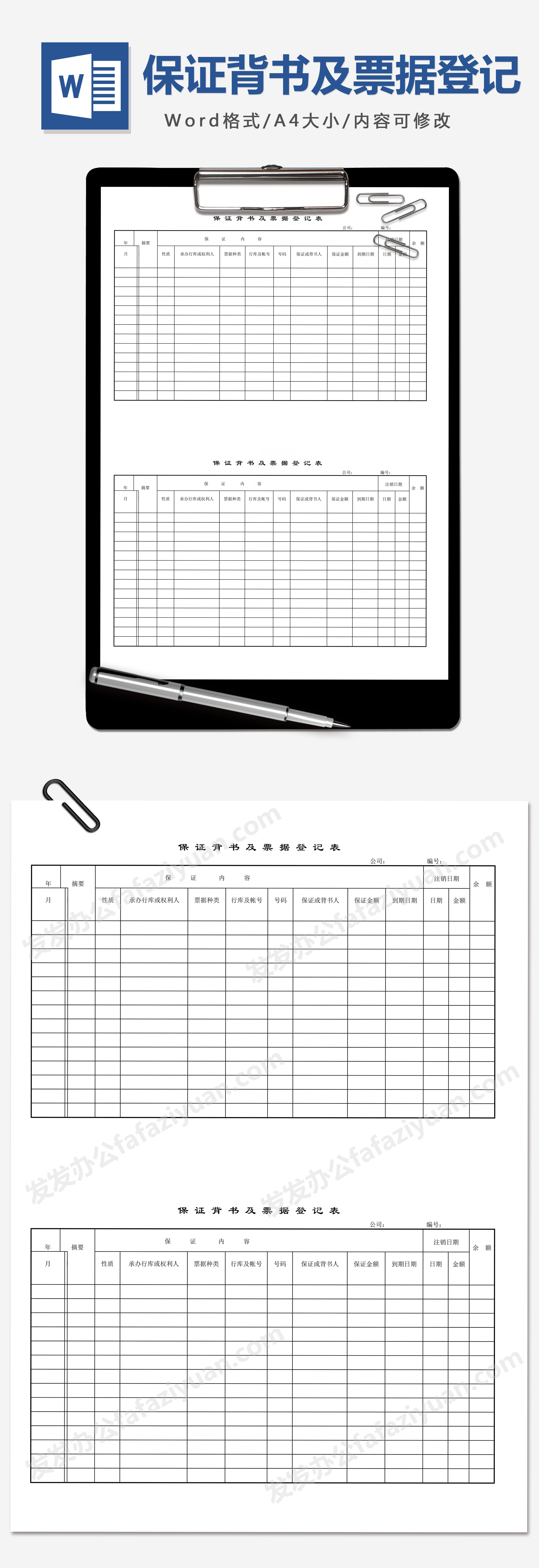 本作品内容为保证背书及票据登记表免费下载, 格式为 docx, 大小1 MB, 页数为1, 请使用软件Word打开, 作品中主体文字及图片可替换修改,文字修改可直接点击文本框进行编辑,图片更改可选中图片后单击鼠标右键选择更换图片,也可根据自身需求增加和删除作品中的内容, 源文件无水印, 欢迎使用发发资源库。 资源下载此资源仅限注册用户下载,请先登录