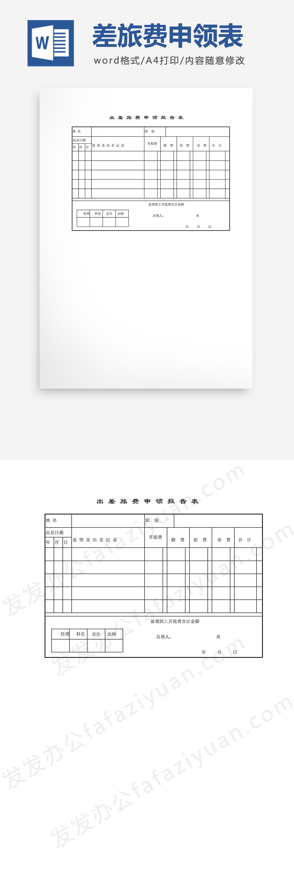 本作品内容为出差旅费申领报告表Word模板免费下载, 格式为 docx, 大小1 MB, 页数为1, 请使用软件Word打开, 作品中主体文字及图片可替换修改,文字修改可直接点击文本框进行编辑,图片更改可选中图片后单击鼠标右键选择更换图片,也可根据自身需求增加和删除作品中的内容, 源文件无水印, 欢迎使用发发资源库。