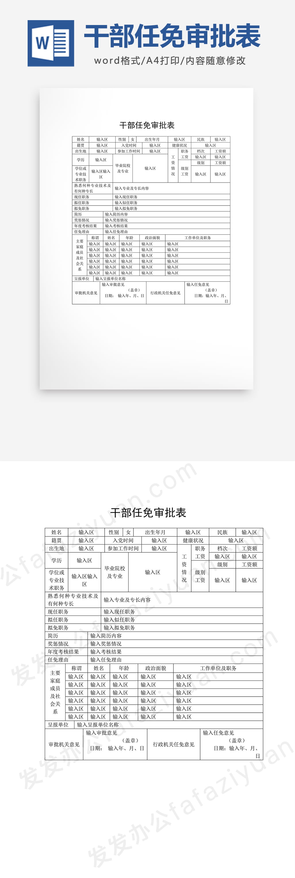 本作品内容为干部任免审批表Word模板免费下载, 格式为 docx, 大小1 MB, 页数为1, 请使用软件Word打开, 作品中主体文字及图片可替换修改,文字修改可直接点击文本框进行编辑,图片更改可选中图片后单击鼠标右键选择更换图片,也可根据自身需求增加和删除作品中的内容, 源文件无水印, 欢迎使用发发资源库。