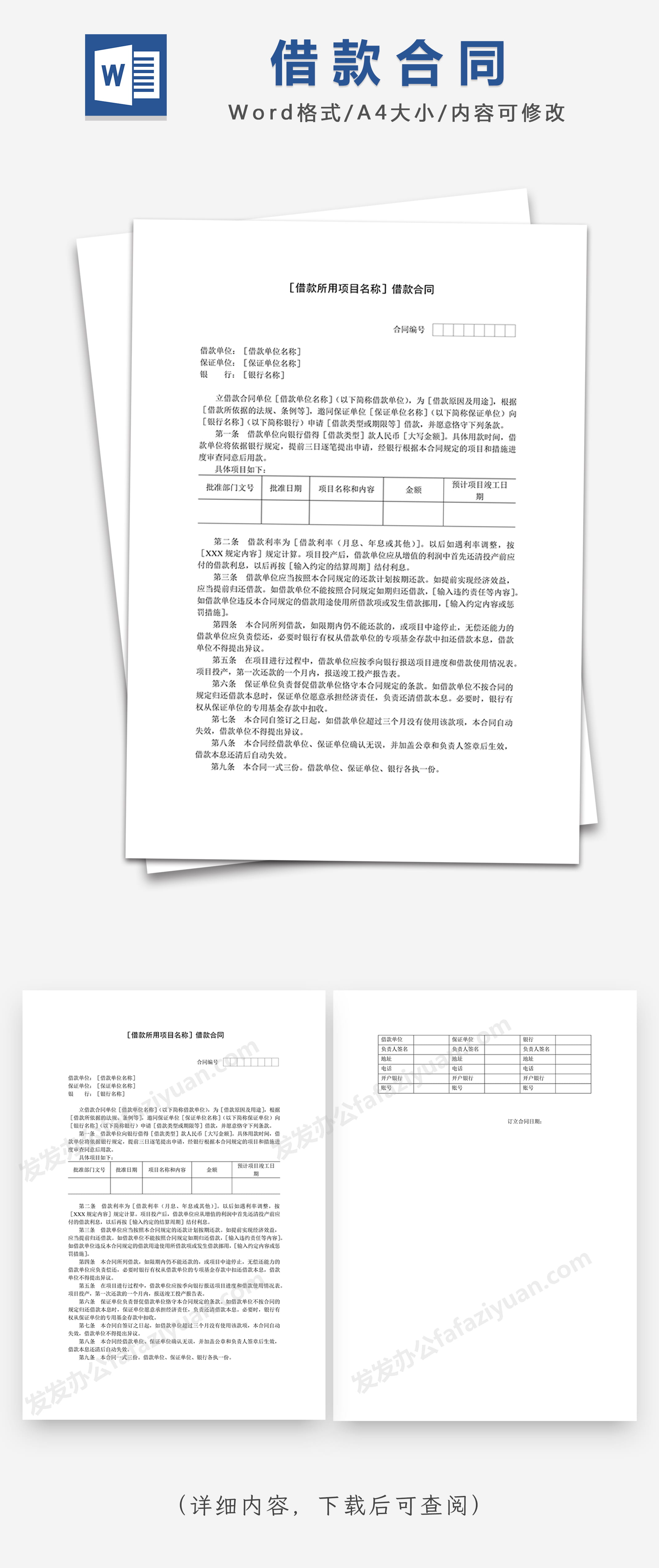 本作品内容为借款合同Word模板, 格式为 docx, 大小1 MB, 页数为2, 请使用软件Word打开, 作品中主体文字及图片可替换修改,文字修改可直接点击文本框进行编辑,图片更改可选中图片后单击鼠标右键选择更换图片,也可根据自身需求增加和删除作品中的内容, 源文件无水印, 欢迎使用发发资源库。