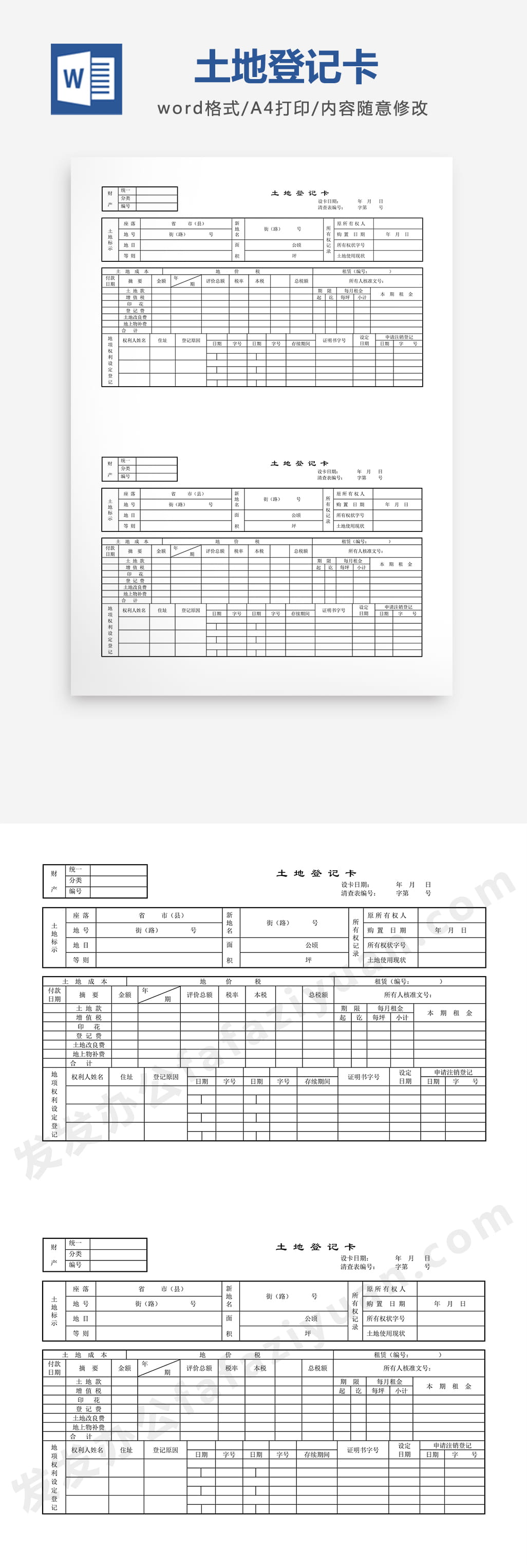 本作品内容为土地登记卡Word模板, 格式为 docx, 大小1 MB, 页数为1, 请使用软件Word打开, 作品中主体文字及图片可替换修改,文字修改可直接点击文本框进行编辑,图片更改可选中图片后单击鼠标右键选择更换图片,也可根据自身需求增加和删除作品中的内容, 源文件无水印, 欢迎使用发发资源库。