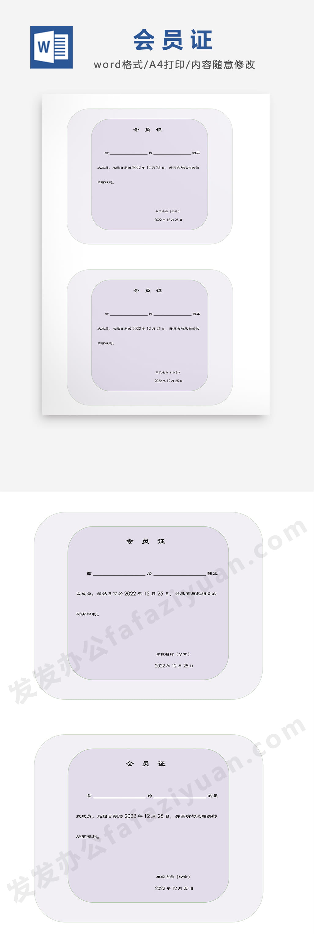 本作品内容为会员证Word设计, 格式为 docx, 大小1 MB, 页数为1, 请使用软件Word打开, 作品中主体文字及图片可替换修改,文字修改可直接点击文本框进行编辑,图片更改可选中图片后单击鼠标右键选择更换图片,也可根据自身需求增加和删除作品中的内容, 源文件无水印, 欢迎使用发发资源库。 资源下载此资源下载价格为8.8F币,VIP免费,请先登录