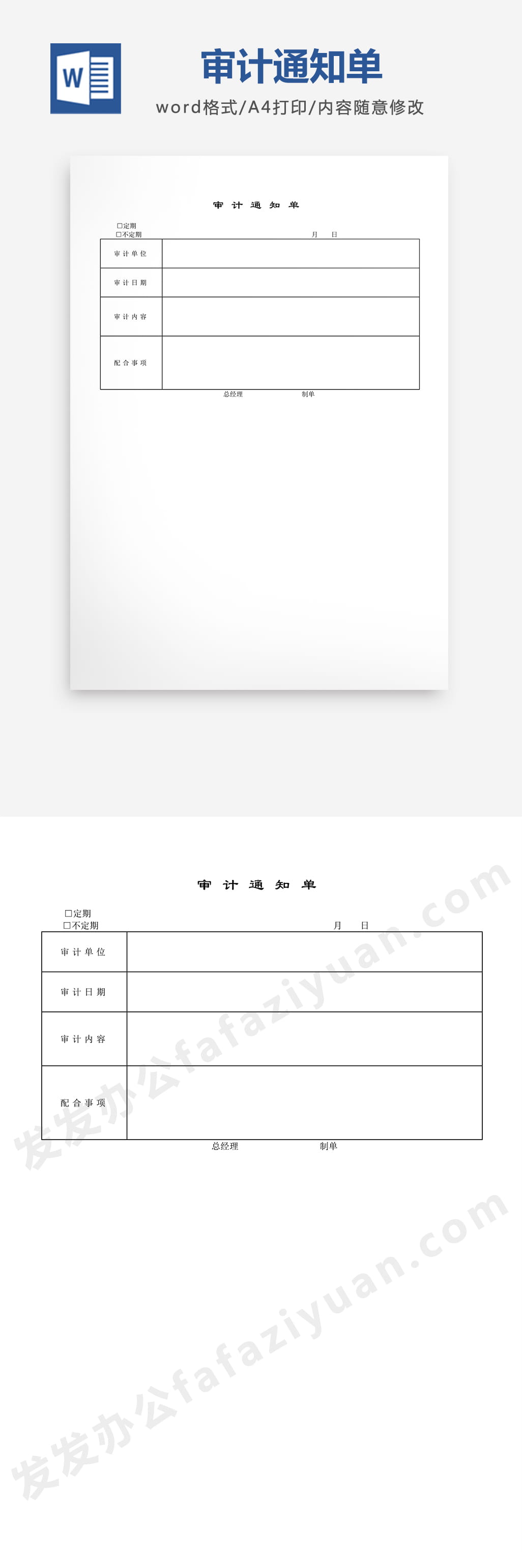 本作品内容为审计通知单Word模板免费下载, 格式为 docx, 大小1 MB, 页数为1, 请使用软件Word打开, 作品中主体文字及图片可替换修改,文字修改可直接点击文本框进行编辑,图片更改可选中图片后单击鼠标右键选择更换图片,也可根据自身需求增加和删除作品中的内容, 源文件无水印, 欢迎使用发发资源库。