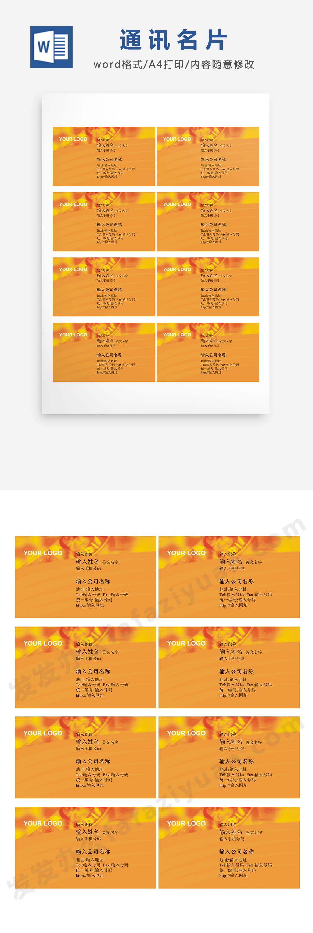 本作品内容为通讯名片Word设计, 格式为 docx, 大小1 MB, 页数为1, 请使用软件Word打开, 作品中主体文字及图片可替换修改,文字修改可直接点击文本框进行编辑,图片更改可选中图片后单击鼠标右键选择更换图片,也可根据自身需求增加和删除作品中的内容, 源文件无水印, 欢迎使用发发资源库。 资源下载此资源下载价格为8.8F币,VIP免费,请先登录