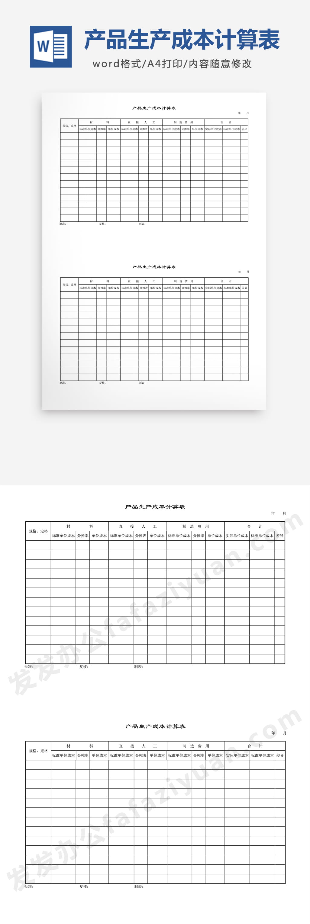 本作品内容为产品生产成本计算表Word模板, 格式为 docx, 大小1 MB, 页数为1, 请使用软件Word打开, 作品中主体文字及图片可替换修改,文字修改可直接点击文本框进行编辑,图片更改可选中图片后单击鼠标右键选择更换图片,也可根据自身需求增加和删除作品中的内容, 源文件无水印, 欢迎使用发发资源库。