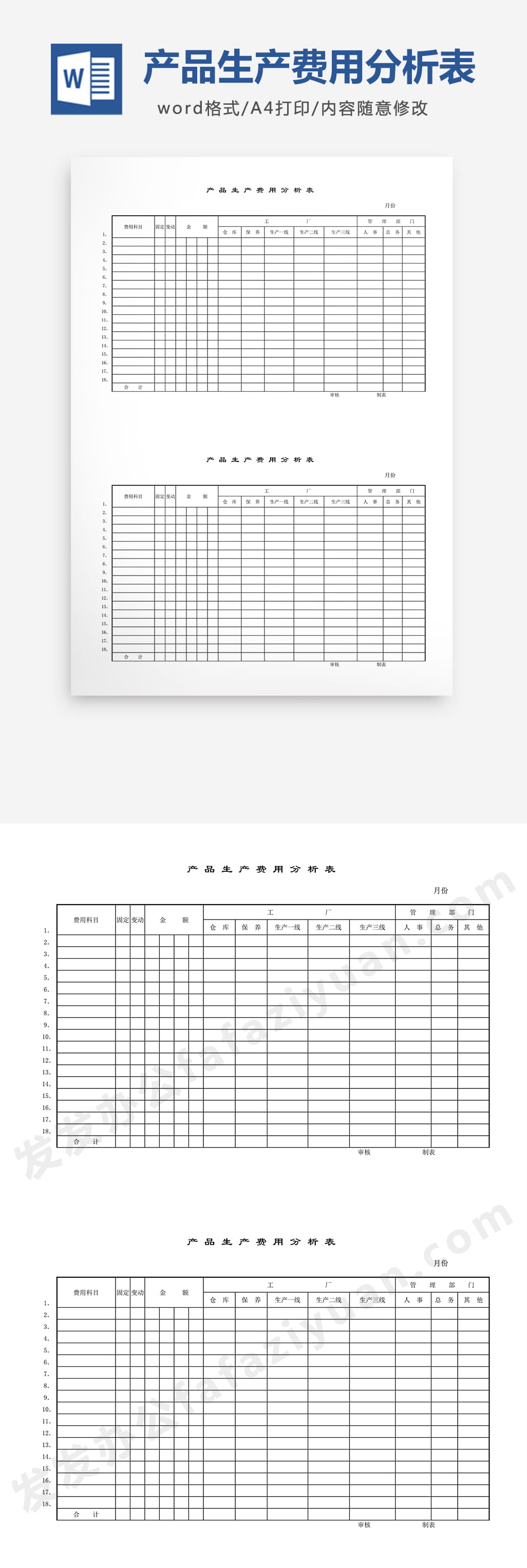 本作品内容为产品生产费用分析表Word模板, 格式为 docx, 大小1 MB, 页数为1, 请使用软件Word打开, 作品中主体文字及图片可替换修改,文字修改可直接点击文本框进行编辑,图片更改可选中图片后单击鼠标右键选择更换图片,也可根据自身需求增加和删除作品中的内容, 源文件无水印, 欢迎使用发发资源库。