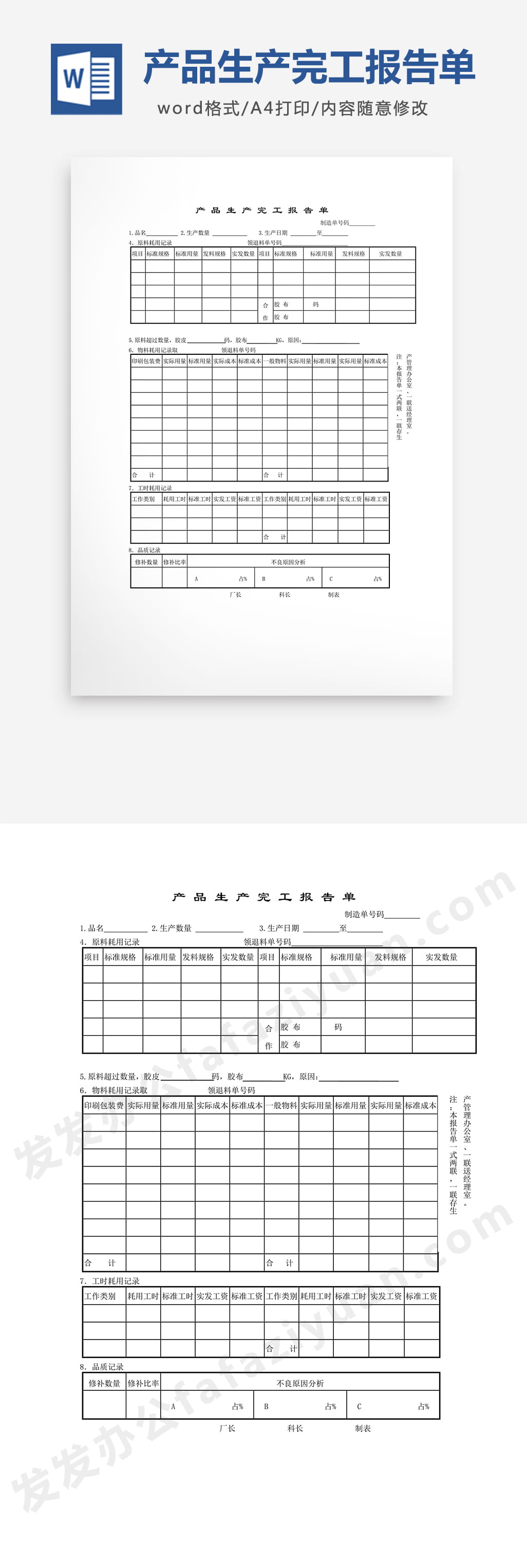本作品内容为产品生产完工报告单Word模板, 格式为 docx, 大小1 MB, 页数为1, 请使用软件Word打开, 作品中主体文字及图片可替换修改,文字修改可直接点击文本框进行编辑,图片更改可选中图片后单击鼠标右键选择更换图片,也可根据自身需求增加和删除作品中的内容, 源文件无水印, 欢迎使用发发资源库。